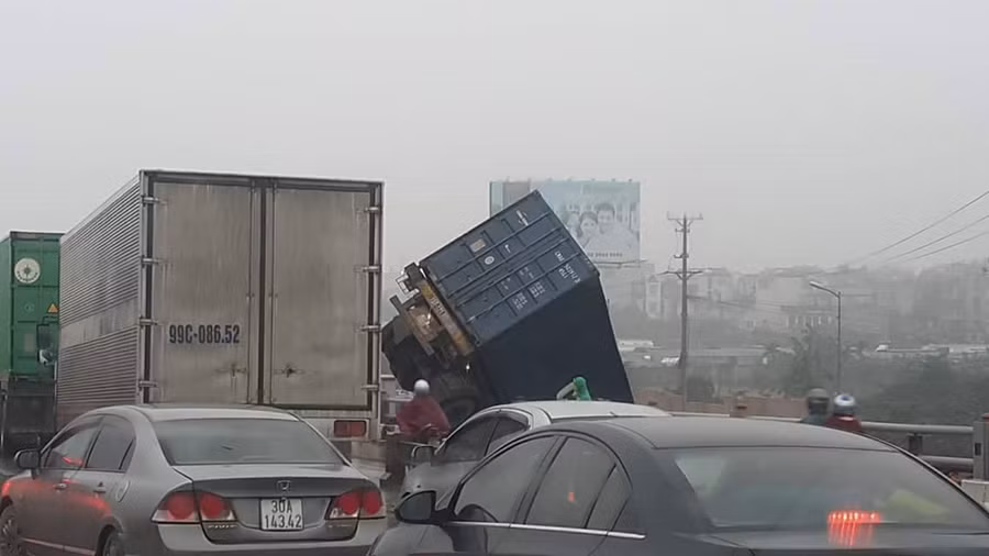 Cách vị trí trên không xa theo chiều ngược lại, một chiếc container đang lưu thông bất ngờ lao sang làn đường dành cho xe cơ giới rồi vươn khỏi thành cầu.