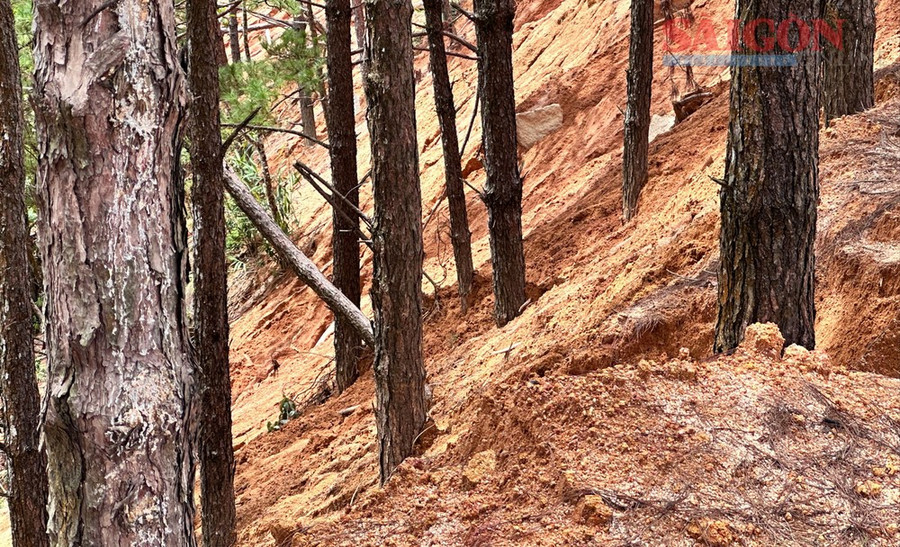 Tại tiểu khu 474, thôn 2, xã Đại Lào, phóng viên Báo SGGP ghi nhận có hàng trăm cây thông đường kính khoảng 20 – 40cm bị đất vùi lấp gốc từ 1 – 3 mét.