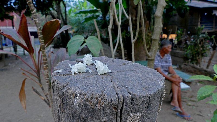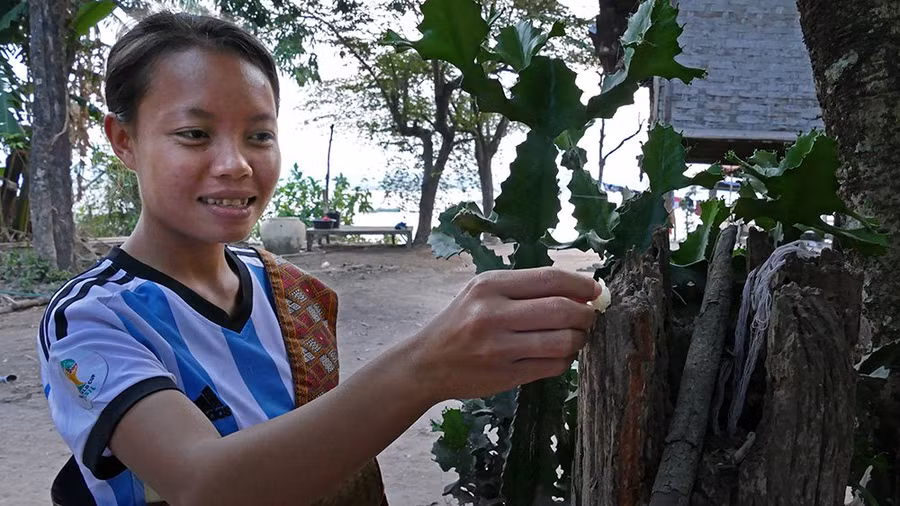 Sau khi hành lễ, phật tử sống tại bản Khon, huyện Champasak, tỉnh Champasak đính những cục xôi nhỏ lên các hàng rào quanh nhà để chim chóc có cái ăn.
