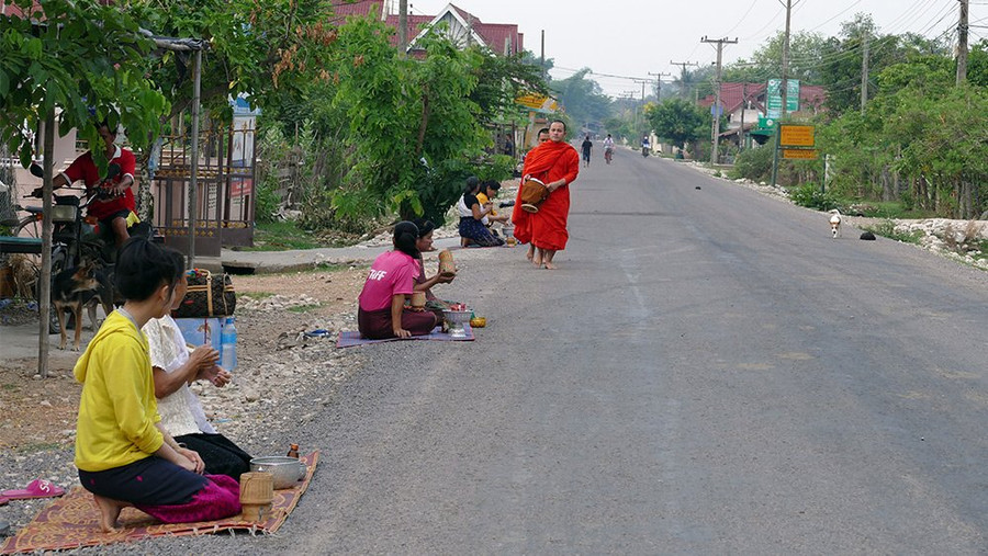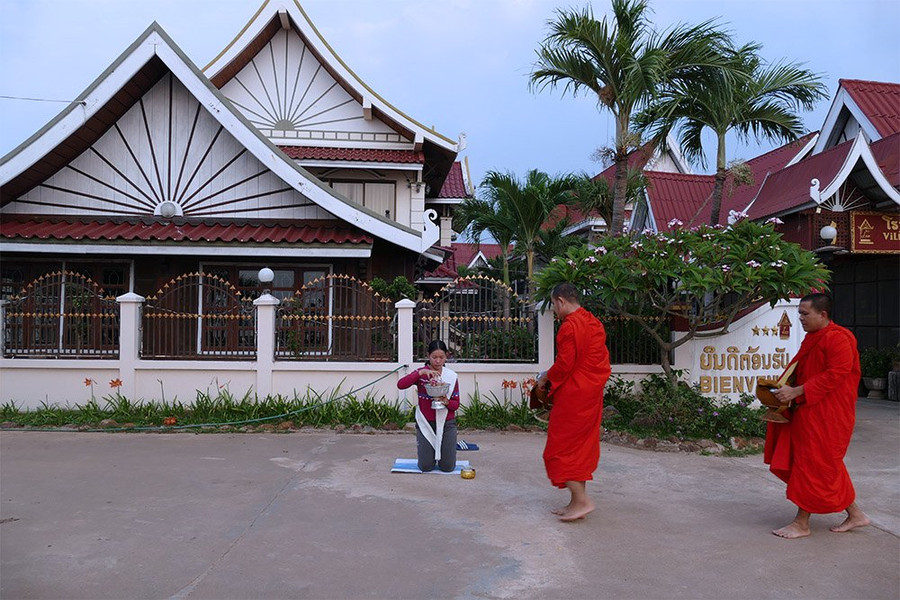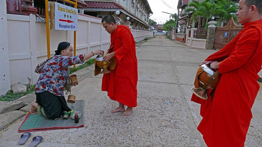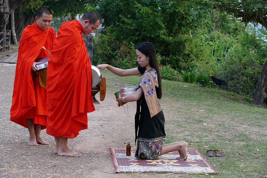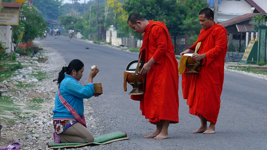 Phật giáo từ lâu đã trở thành quốc giáo ở Lào, vào mỗi buổi sáng những Phật tử mang lễ vật là đồ ăn chín ra trước cửa nhà dâng lễ vật lên các nhà sư hành lễ khất thực. Trong ảnh là cảnh người dân ở tỉnh Pakse chuẩn bị dâng lễ vật cho các nhà sư đi khất thực.