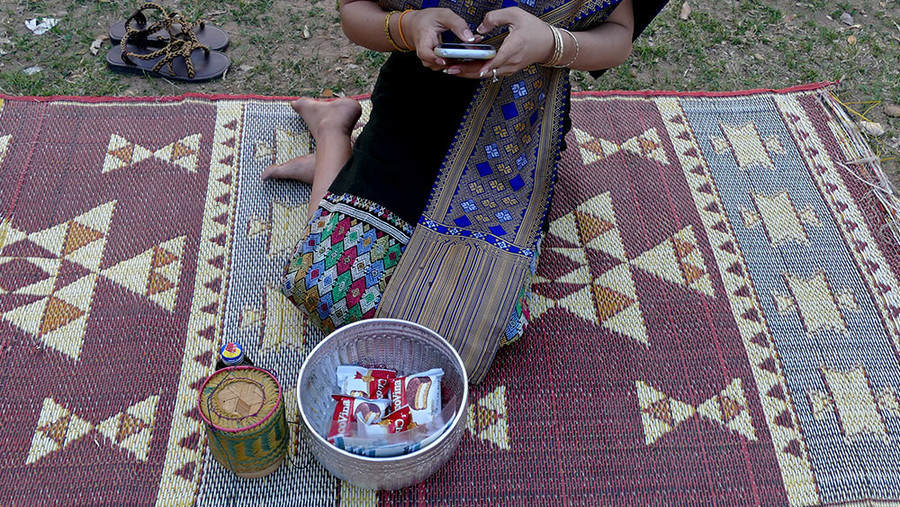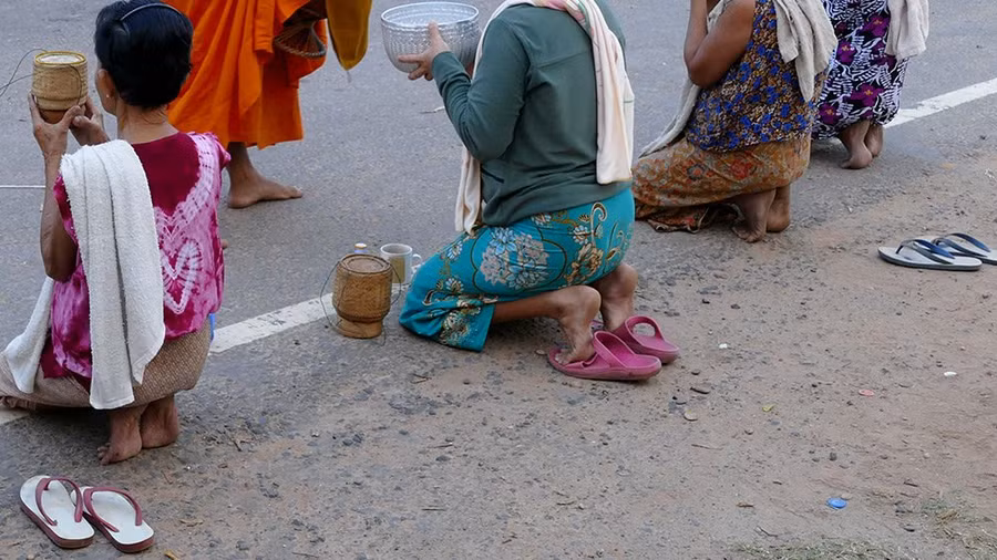 Các Phật tử ở huyện Champasak, tỉnh Champasak để chân trần, quì gối, chắp tay trước ngực dâng đồ lễ cho nhà sư hành lễ khất thực. Khi hành lễ cả nhà sư và phật tử phải để chân trần.