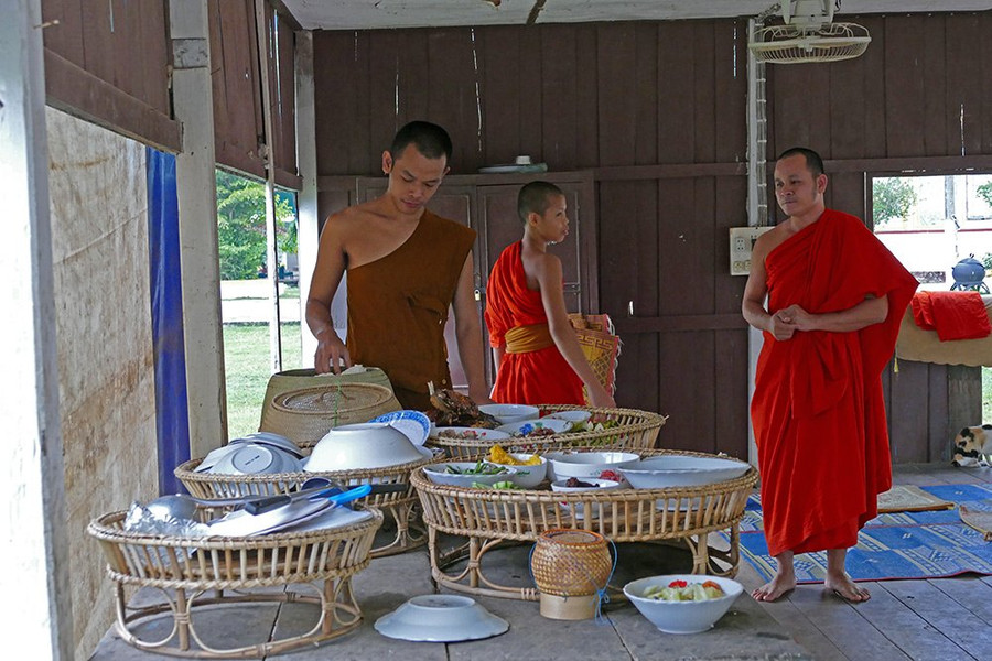 Theo giới luật của phật giáo nguyên thủy, phật tử chỉ cúng bằng thức ăn đã nấu chín như cúng cơm chứ không cúng gạo, cúng rau đã nấu chín chứ không cúng rau tươi. Vì vậy mà nhà chùa không có bếp (Ảnh chụp tại một khu phố thuộc tỉnh Pakse).