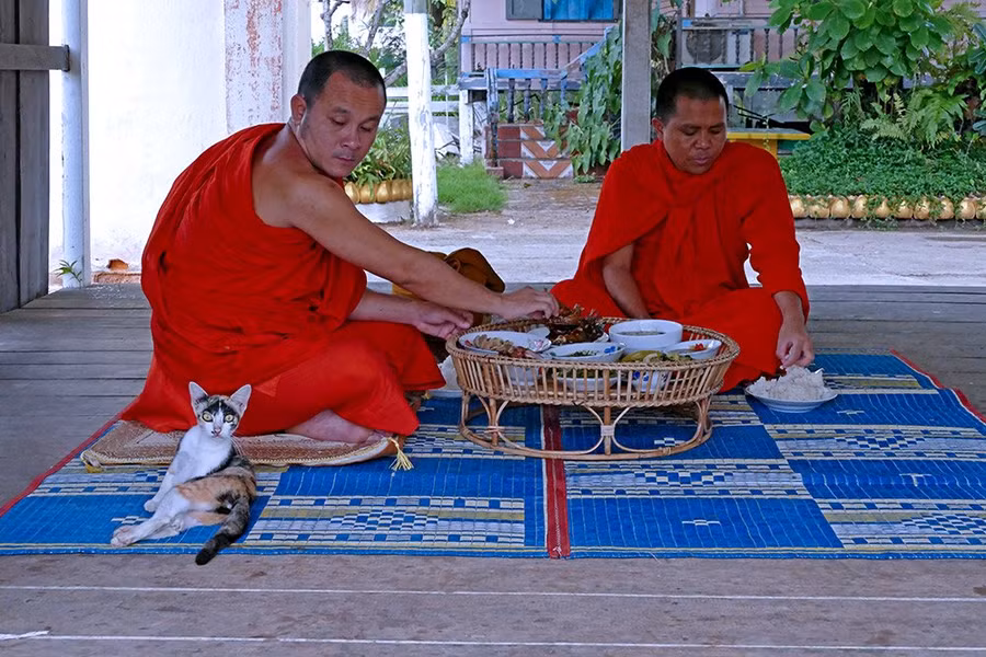 Các nhà sư ở Lào chỉ đi khất thực đến trước giờ ngọ (12 giờ trưa), chỉ lấy thức ăn đã chín, không khất thực quá 7 nhà, không phân biệt giàu nghèo, thức ăn ngon dở, không đứng trước cửa chợ và một ngày chỉ ăn một bữa trước khi trời đứng bóng.
