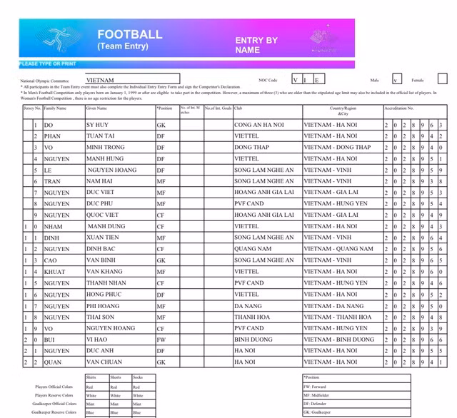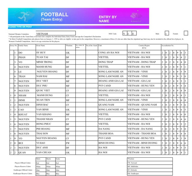 Trên đây là thành phần dự kiến 22 cầu thủ đội tuyển Olympic Việt Nam dự ASIAD 19 tại Hàng Châu (Trung Quốc). Môn bóng đá nam Á vận hội khởi tranh từ 19.9 đến 7.10.2023.