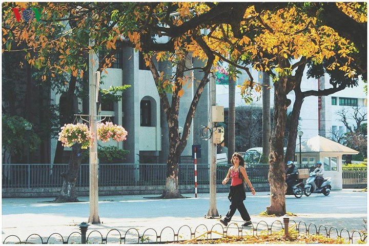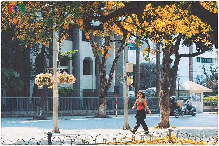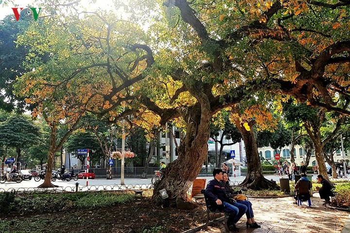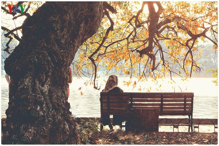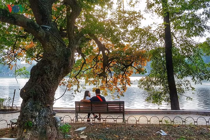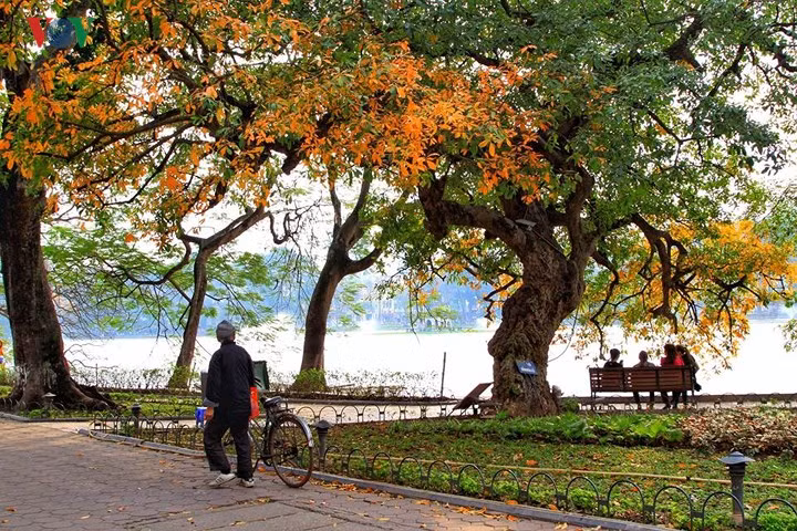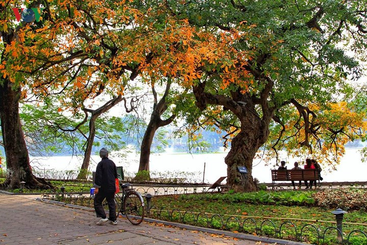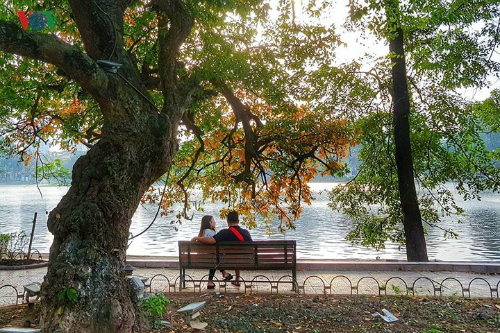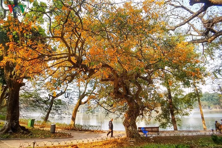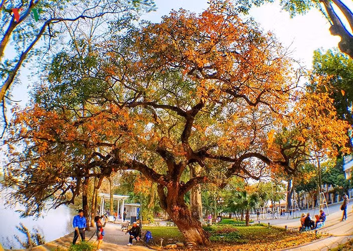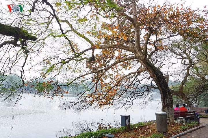 Những ngày này, ai ngang qua Hồ Gươm cũng cảm thấy "rung rinh" trước vẻ đẹp lãng mạn khi cây lộc vừng đổi màu lá từ xanh sang vàng và đỏ trước khi rời cành.