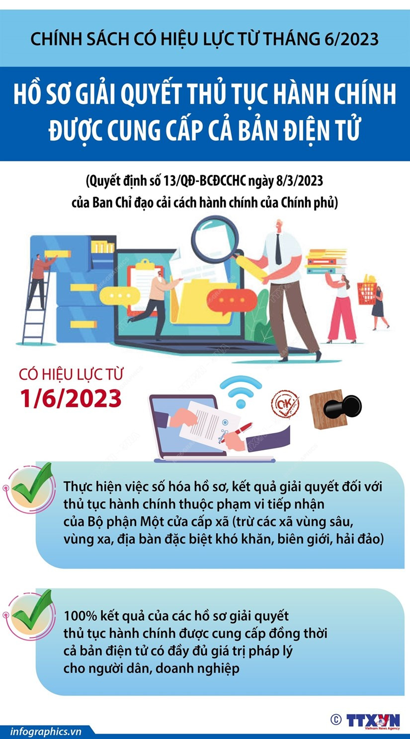 Theo đó, thực hiện việc số hóa hồ sơ, kết quả giải quyết đối với thủ tục hành chính thuộc phạm vi tiếp nhận của Bộ phận Một cửa cấp xã (trừ các xã vùng sâu, vùng xa, địa bàn đặc biệt khó khăn, biên giới, hải đảo); 100% kết quả của các hồ sơ giải quyết thủ tục hành chính được cung cấp đồng thời cả bản điện tử có đầy đủ giá trị pháp lý cho người dân, doanh nghiệp.