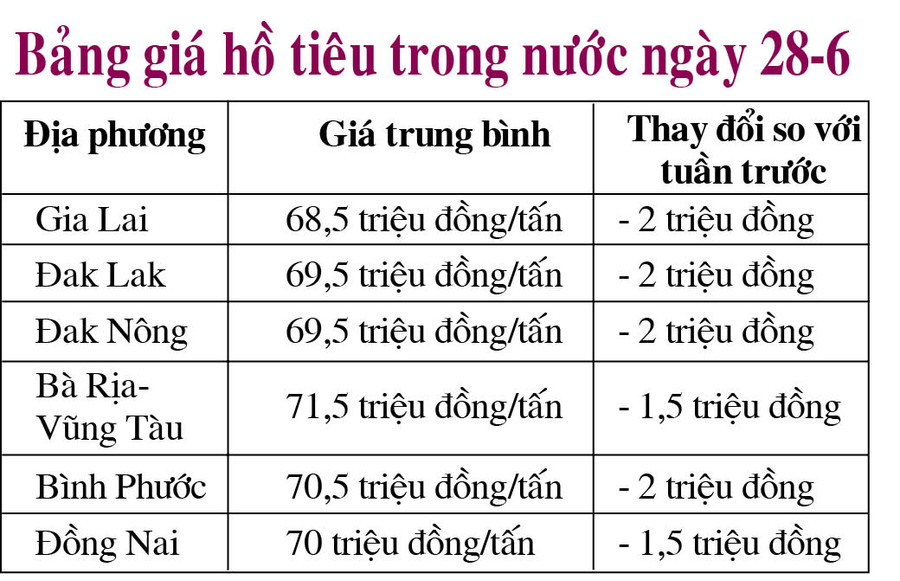 Trong khi đó, với mức giảm 1,5 triệu đồng/tấn, hồ tiêu tại tỉnh Đồng Nai và Bà Rịa-Vũng Tàu lần lượt có giá 70 triệu đồng/tấn và 71,5 triệu đồng/tấn.