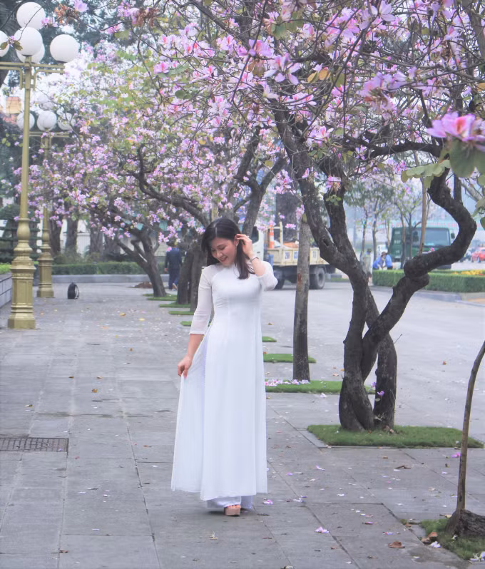 Trang phục áo dài trắng truyền thống, giản dị khoe sắc bên những cánh hoa ban tím dịu dàng.