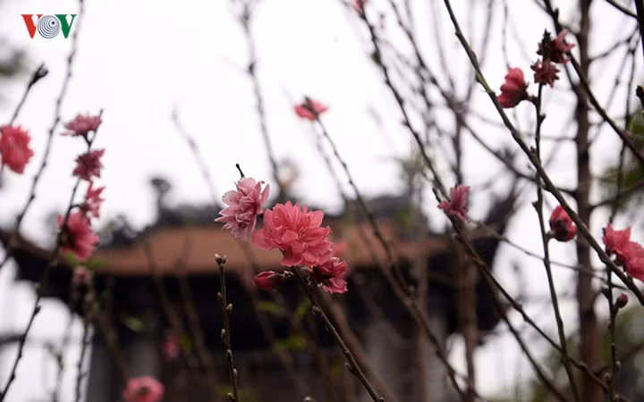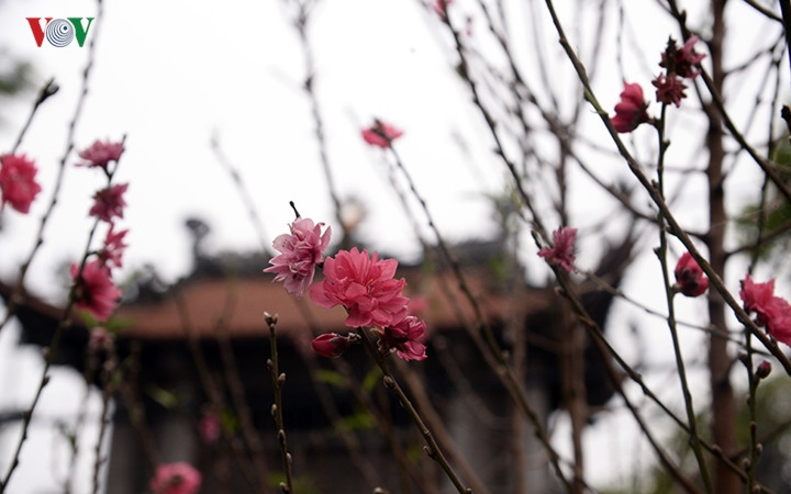 Trước của chùa Vạn Niên và Tảo Sách những cây hoa đào tại giải phân cách giữa đã nở rộ.
