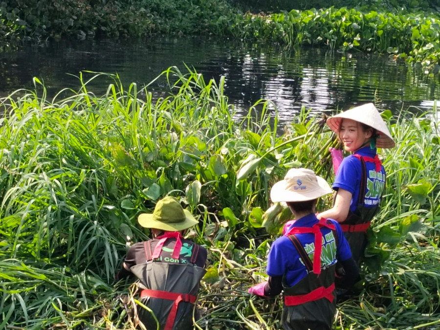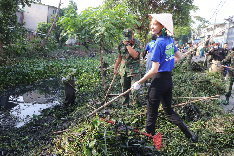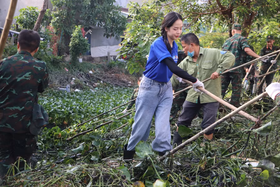 | Các hoa hậu cùng dọn dẹp, cải tạo con kênh với người dân, đoàn viên, thanh niên |