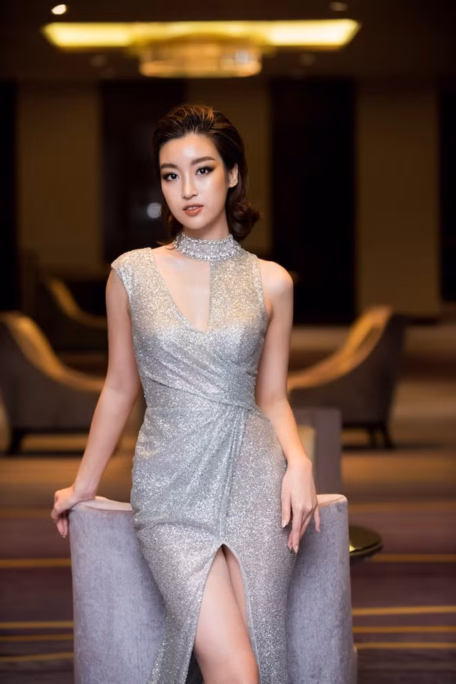 Xuất hiện nổi bật tại một sự kiện trong trang phục dạ hội ánh bạc khoe đôi chân dài gợi cảm, Hoa hậu Đỗ Mỹ Linh khéo léo kết hợp bộ trang phục với chiếc giày ánh bạc để “tone sur tone,” đặc biệt là thần thái kiêu sa, lạnh lùng với mái tóc ngắn mới mẻ.