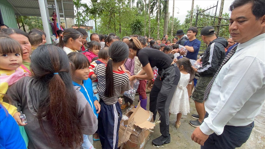 Đoàn đến xã Trà Vân, huyện Nam Trà My, tỉnh Quảng Nam, trực tiếp thăm hỏi, tặng quà gồm tiền mặt và nhu yếu phẩm cho người dân bị ảnh hưởng của vụ sạt lở đất.