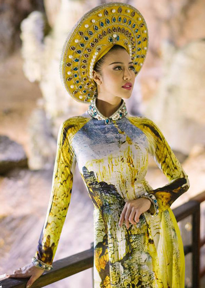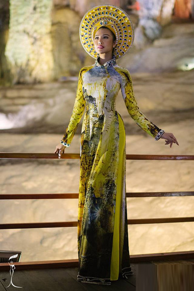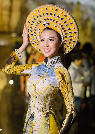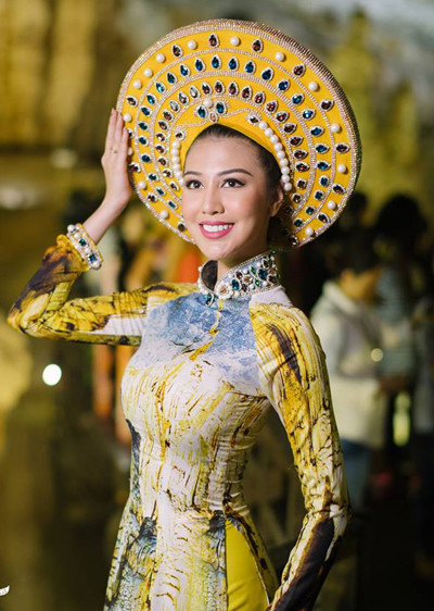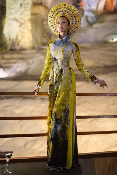 Họa tiết in trên áo dài chính là hình ảnh hang động của Quảng Bình. Ariska Putri Pertiwi đồng hành với các thí sinh trong mọi hoạt động của cuộc thi. Cô cùng 75 người đẹp di chuyển từ TP HCM về Quảng Bình.