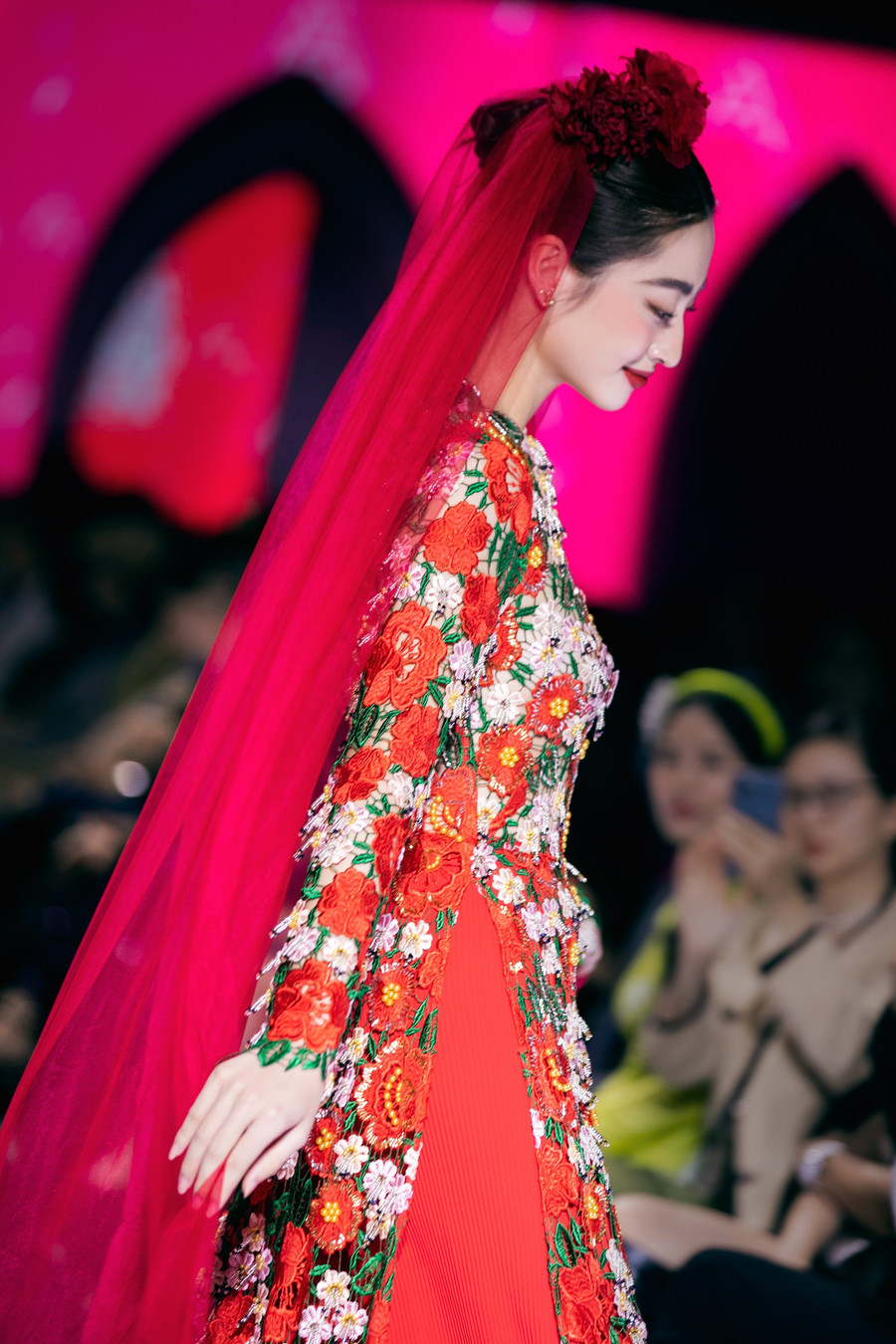 | Áo dài của Lương Thùy Linh được chắt lọc và cách điệu những hình ảnh đặc trưng đậm chất văn hóa Bắc Bộ như hoa cúc, hoa sen, chim hạc, rồng, tùng cúc trúc mai, chim phượng hoàng... để tôn vinh những giá trị di sản và tạo ra nét đẹp riêng biệt của người phụ nữ Việt Nam. |