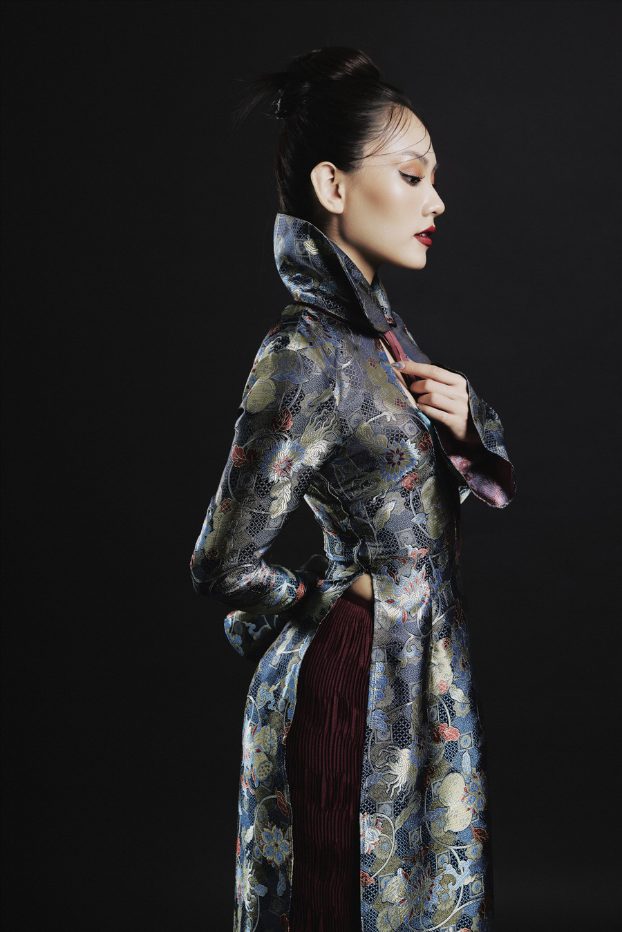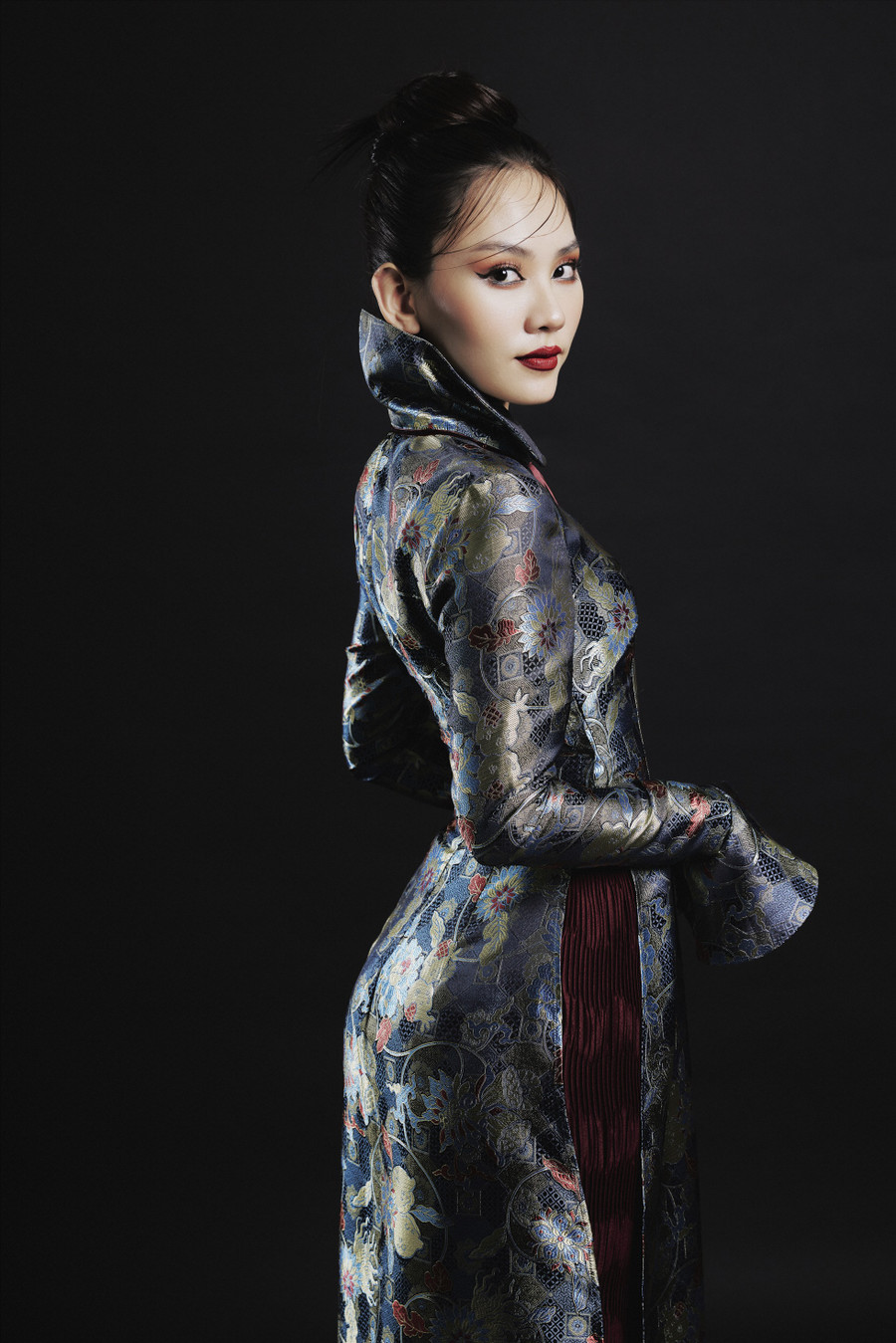 Trong tà áo dài mang chất liệu gấm cùng những đính kết thủ công tỉ mỉ, nàng hậu Mai Phương quảng bá những giá trị văn hoá dân tộc tốt đẹp trong dịp năm mới.