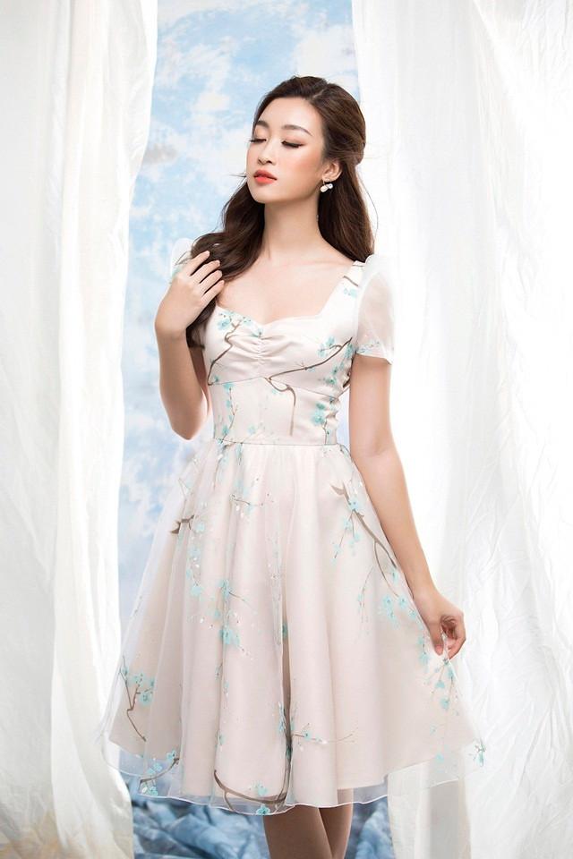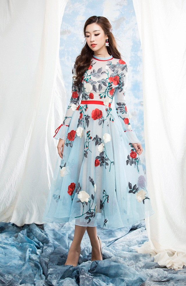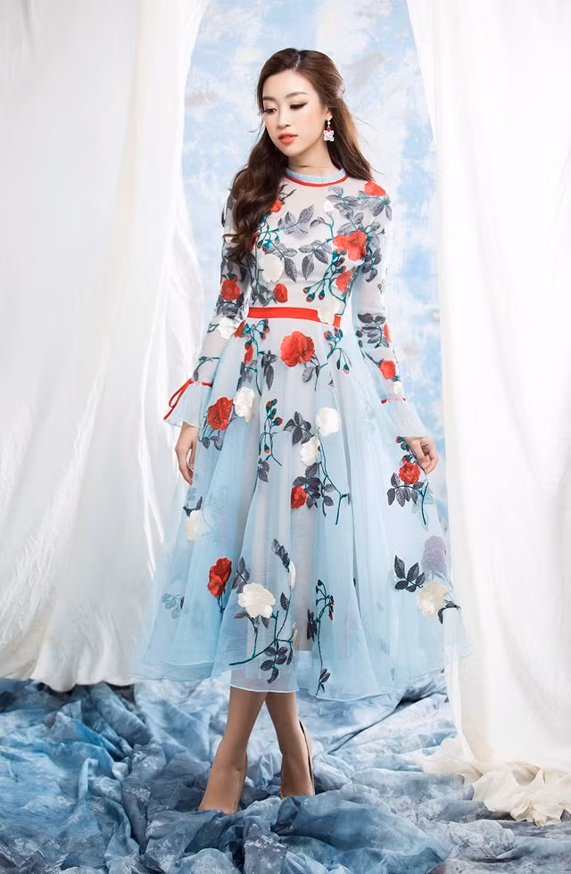 Váy thêu hoa kín đáo sử dụng chất vải voan mỏng, đem tới vẻ mềm mại, có thể diện trong nhiều hoàn cảnh từ đi làm tới dự tiệc.