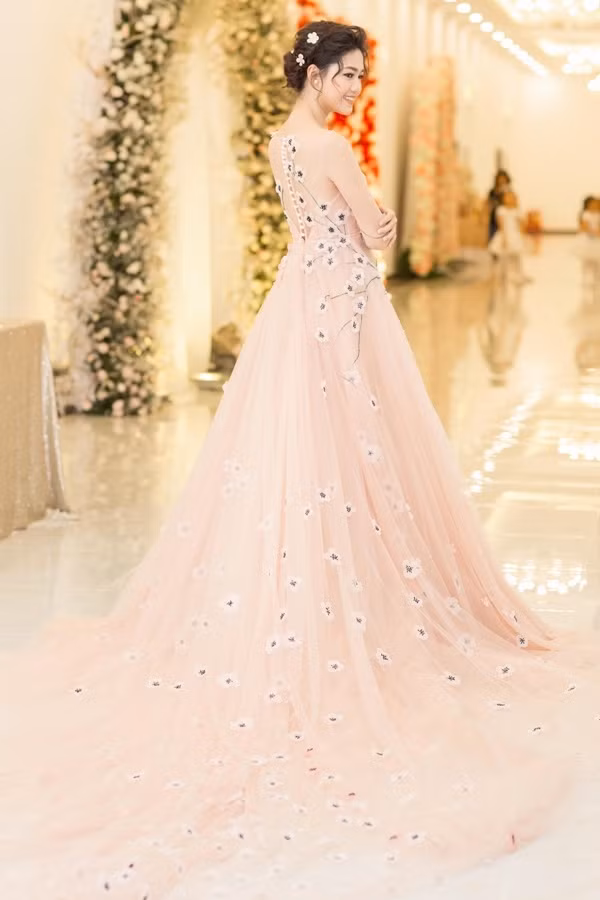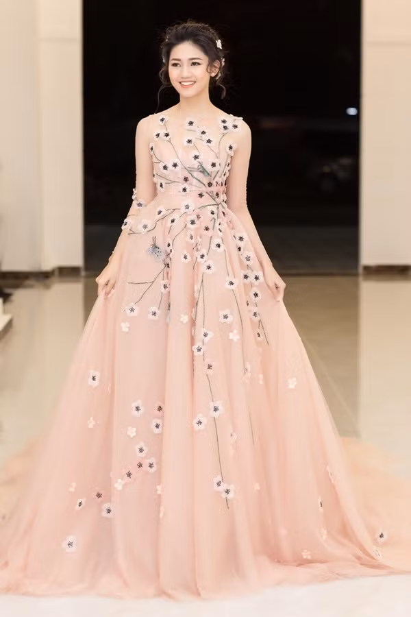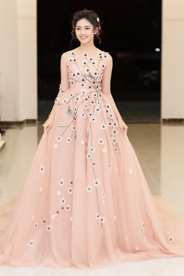 Thanh Tú diện váy hồng pastel đính hoa anh đào của nhà thiết kế Hòa Nguyễn.
