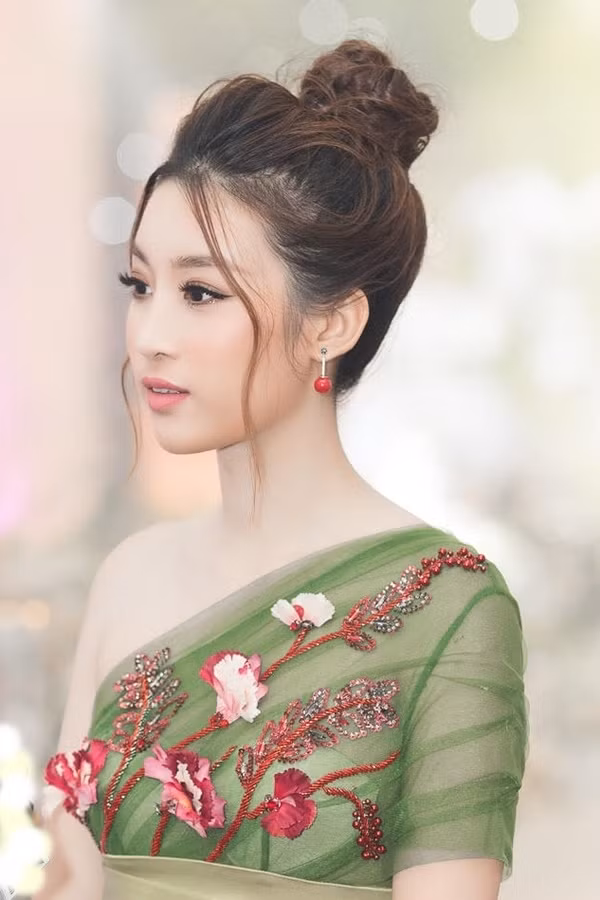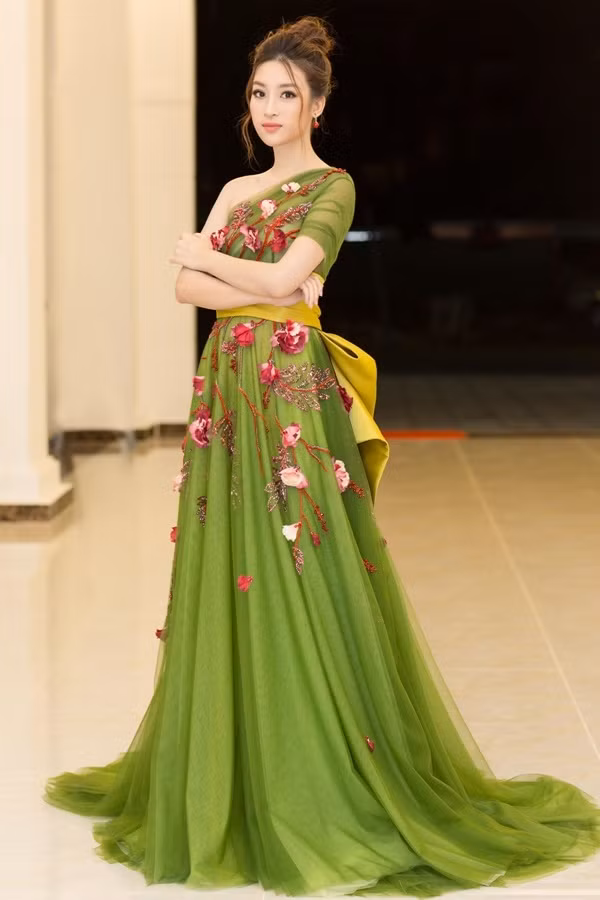 Phần trước của bộ váy có thiết kế lệch, giúp người mặc khoe vai trần. Cô để tóc bới cao, phồng nhẹ.