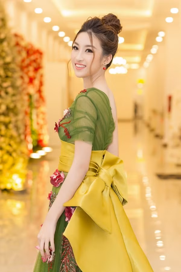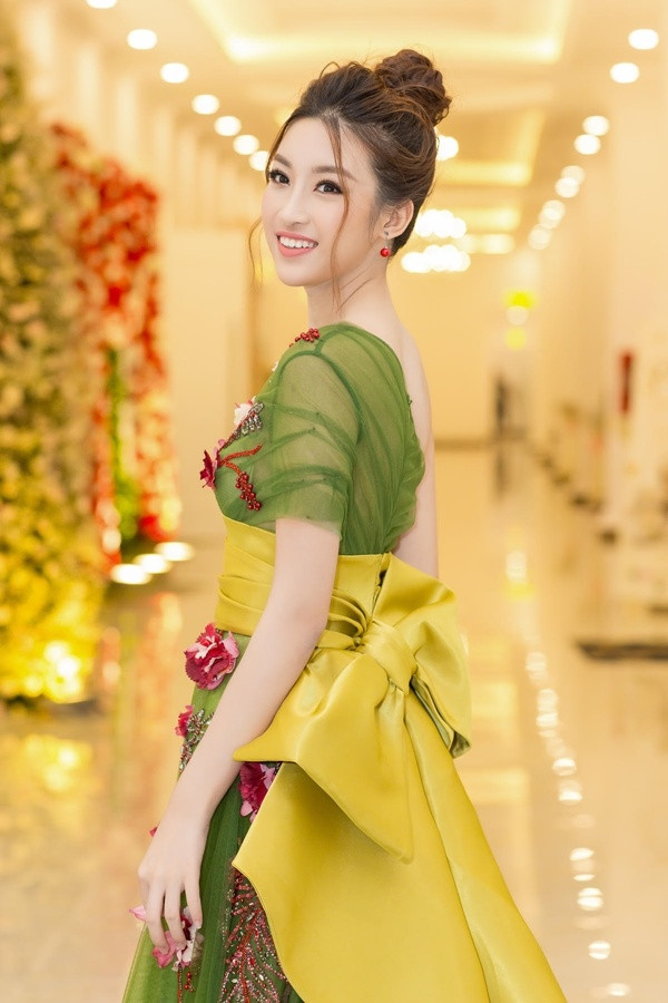 Mỹ Linh dịu dàng với đầm voan đuôi dài, đính kết hoa 3D của Đỗ Long. Phần thắt lưng của váy được đính nơ khổng lồ.