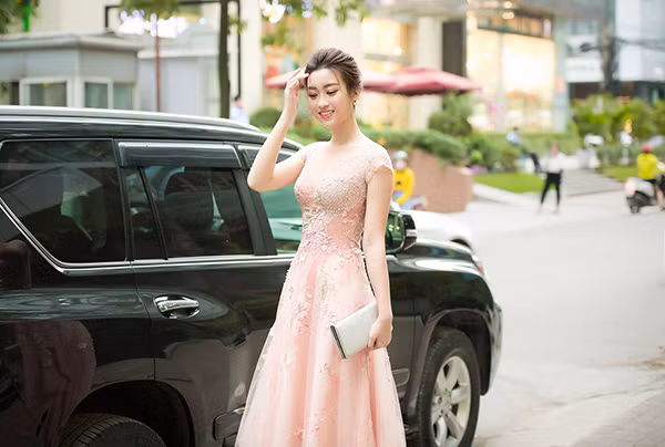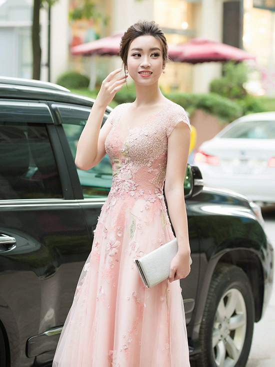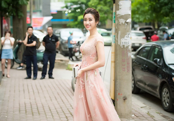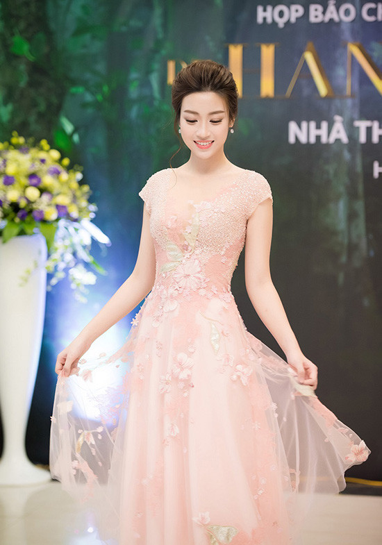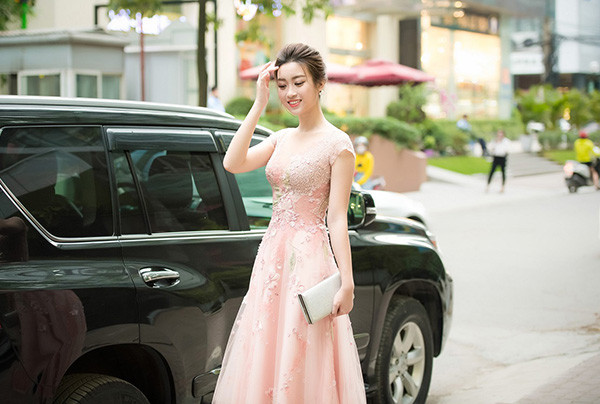 Ngày 11-5, hoa hậu Mỹ Linh được xe sang đưa đến sự kiện họp báo giới thiệu show diễn "De Hanoi à Paris" của nhà thiết kế Hoàng Hải. Người đẹp như một nàng công chúa trong chiếc váy hồng pastel ngọt ngào, khoe làn da trắng ngần.