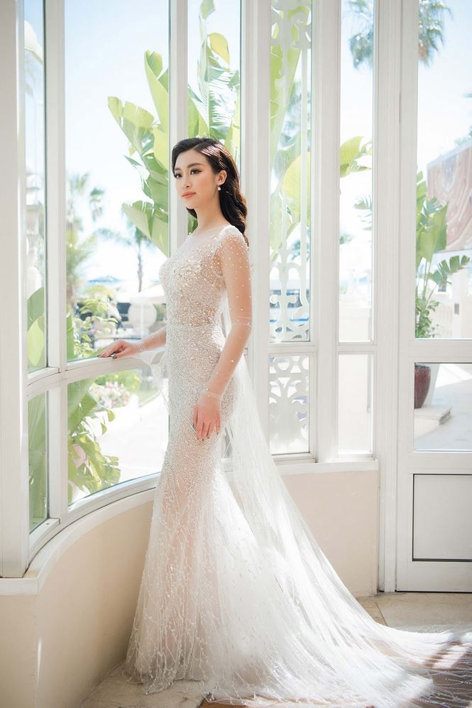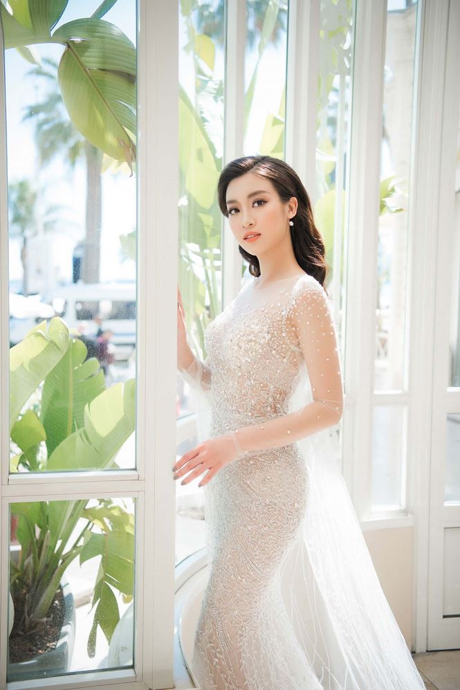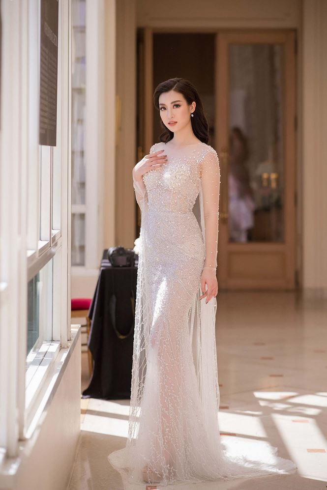 Hoa hậu Việt Nam 2016 diện bộ váy ren xuyên thấu trắng muốt vô cùng gợi cảm.