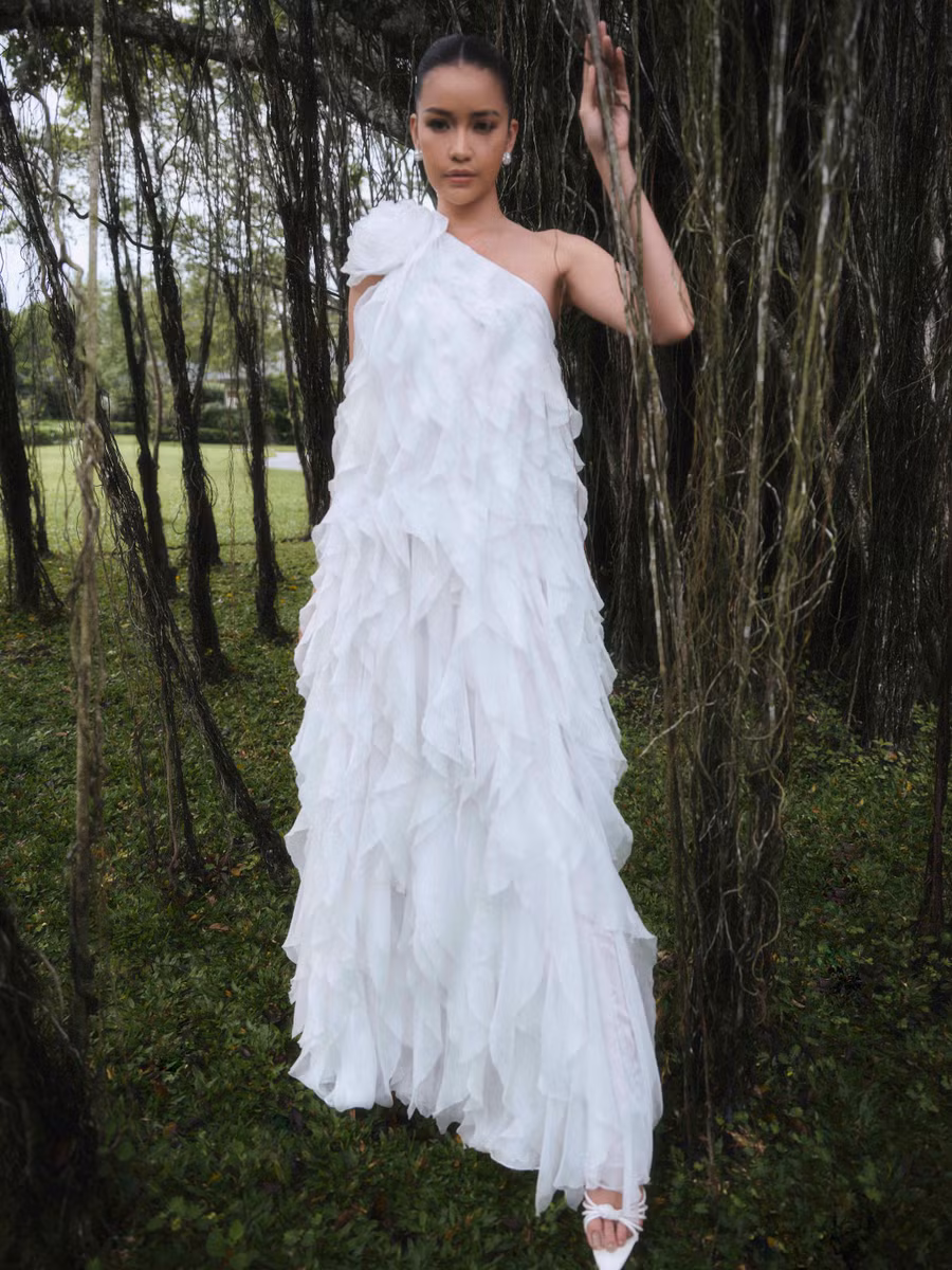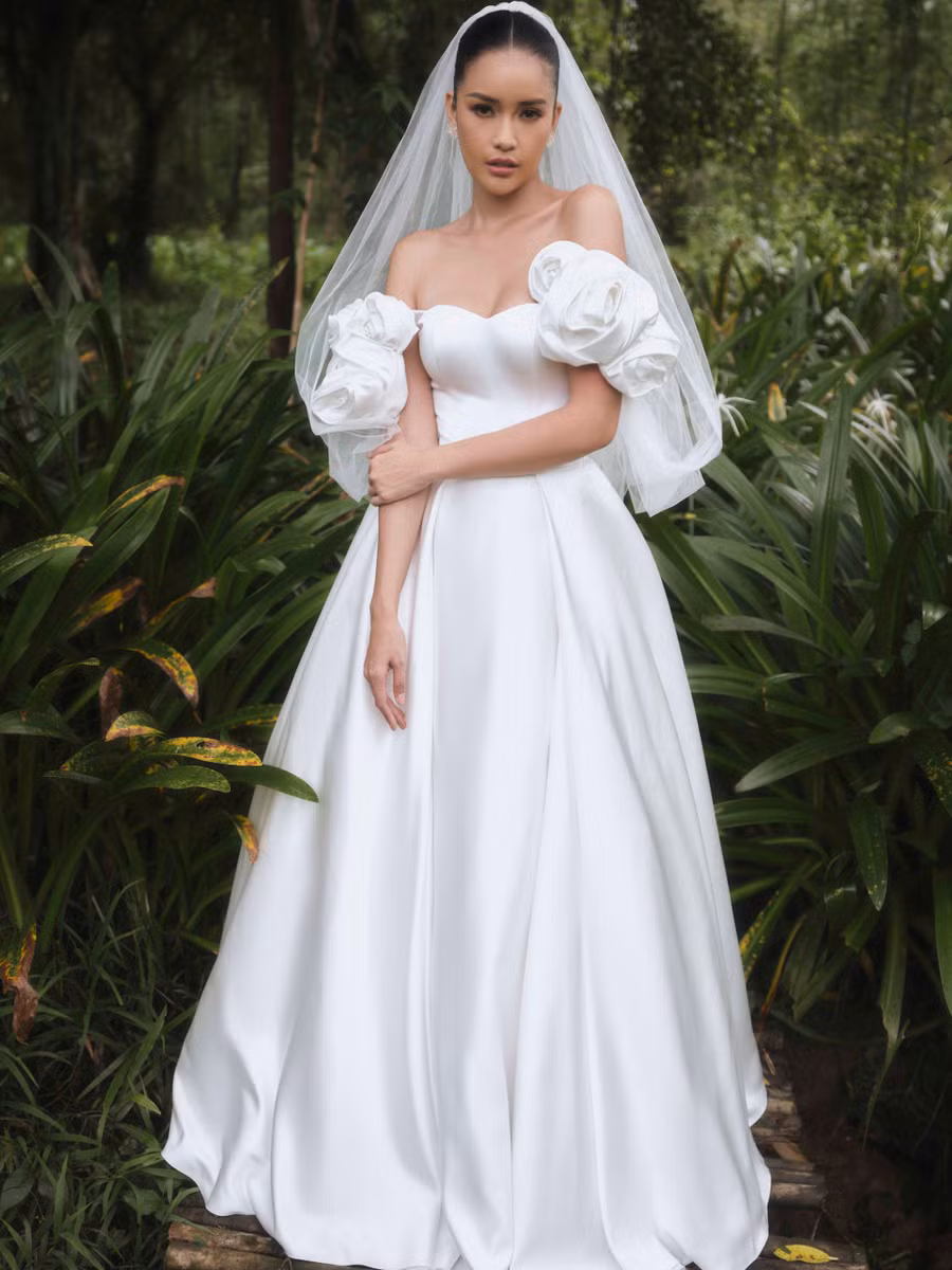Váy cưới được thực hiện trên những chất liệu cao cấp như organza, taffeta, đến ren họa tiết tỉ mỉ… không chỉ giúp các cô dâu tôn dáng quyến rũ mà còn mang theo thông điệp về tình yêu, sự viên mãn trong cuộc sống lứa đôi.