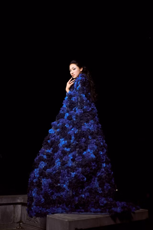 Hoa hậu Thể thao Việt Nam 2022 Đoàn Thu Thủy trình diễn kết thúc bộ sưu tập "Dệt nắng chàm". Diện thiết kế đầm đen với những chi tiết đan dây cùng phần áo choàng khổng lồ, Đoàn Thu Thủy trông cuốn hút. Với thiết kế này, Bùi Hoàng Ân và 6 cộng sự đã phải thực hiện trong hơn 1000 giờ để tỉ mỉ đính kết những bông hoa trên phần áo choàng.