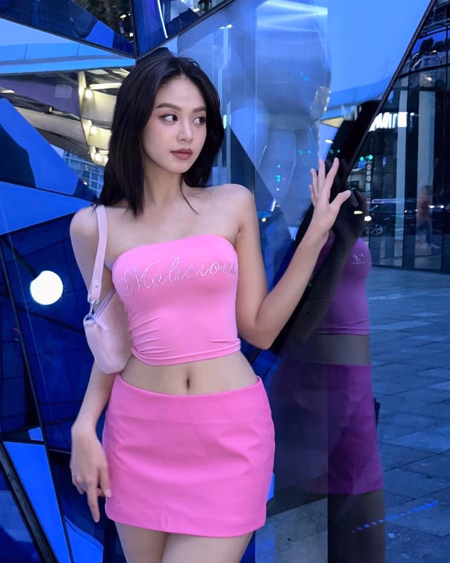 | Những kiểu áo crop-top với tông màu hồng ngọt ngào, nữ tính được Thanh Thủy ứng dụng linh hoạt trong đời thường. Cả set đồ màu hồng gồm áo crop-top kết hợp cùng chân váy và đôi boots trắng mang lại vẻ năng động, cá tính cho người đẹp. |