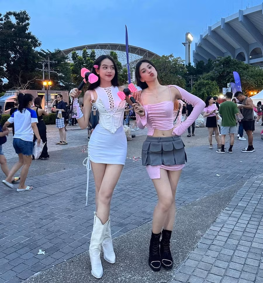 | Phong cách Y2K được Thanh Thủy ưa chuộng, ứng dụng khi đi xem ca nhạc cùng Hoa hậu Tiểu Vy ở Singapore. Nếu Tiểu Vy chọn áo crop-top khoe eo thì Thanh Thủy mặc áo kiểu dáng corset, tuy không hở vòng 2 nhưng vẫn tạo hiệu ứng thon gọn. |