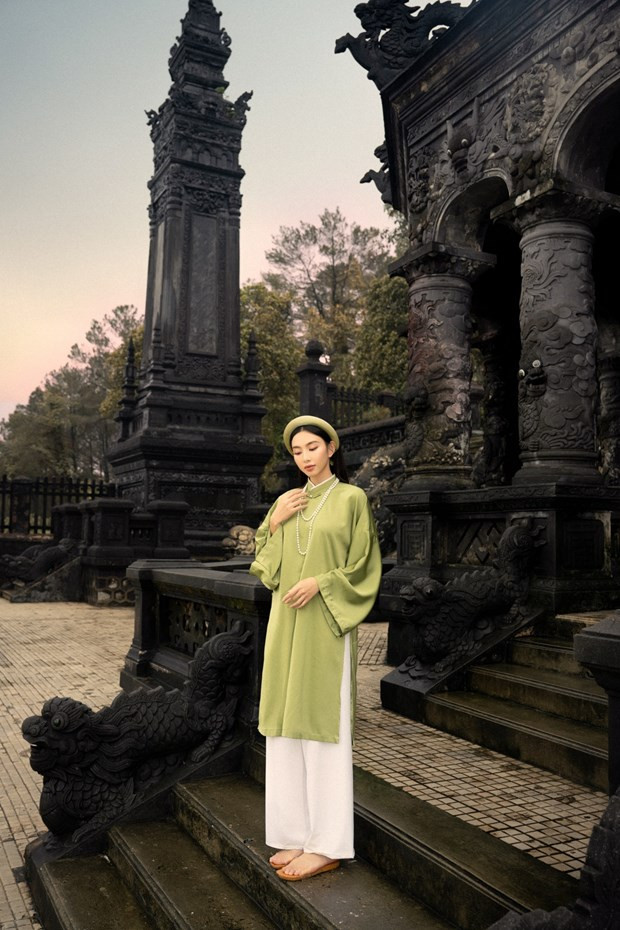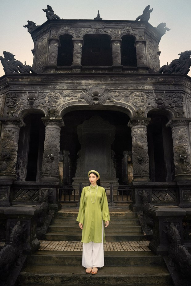 | Hoa hậu Thùy Tiên mặc Cổ phục tại Lăng Khải Định. Ảnh: CTV/Vietnam+ |