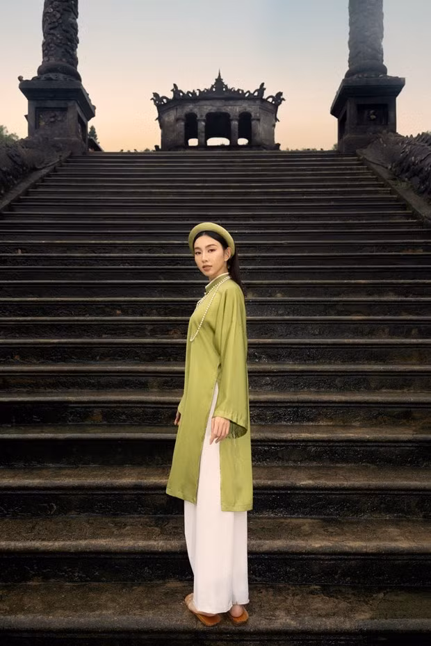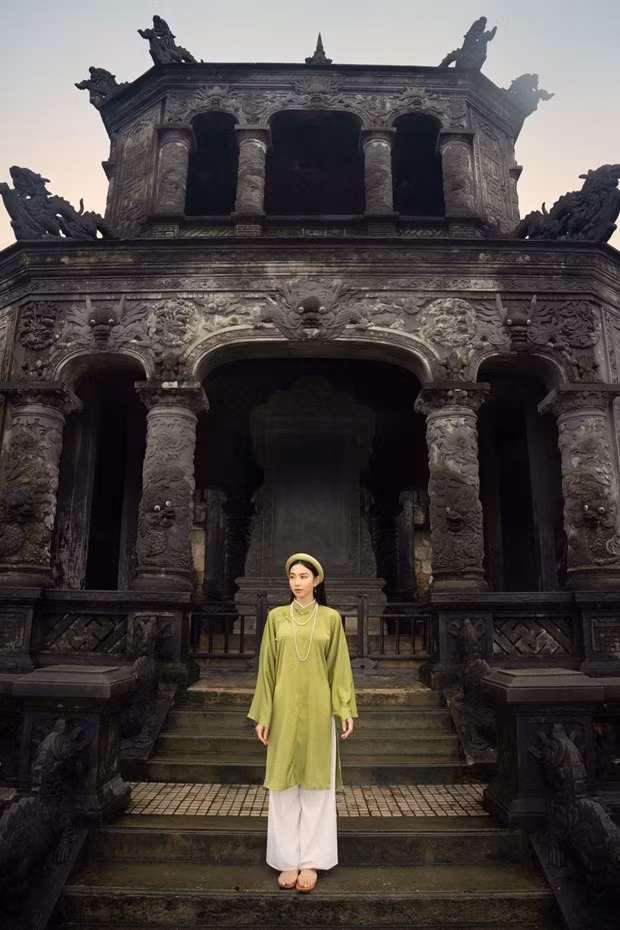 Lăng Khải Định là một trong số các di tích thuộc Quần thể Di tích Cố đô Huế, một trong những lăng tẩm đẹp nhất của vùng đất cố đô, với giá trị cảnh quan, kiến trúc độc đáo. Thùy Tiên chọn Áo Tấc - bộ lễ phục trang trọng, kín đáo, mang nhiều ý nghĩa nhân văn để chụp bộ ảnh đánh dấu cho lần xuất hiện này.