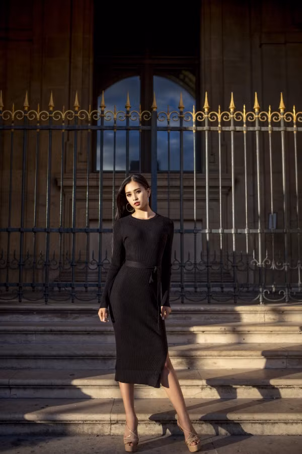 | Hoa hậu Việt Nam 2018 khoe nhan sắc trên đường phố Paris. Cô có gương mặt khả ái, hiện đại. |