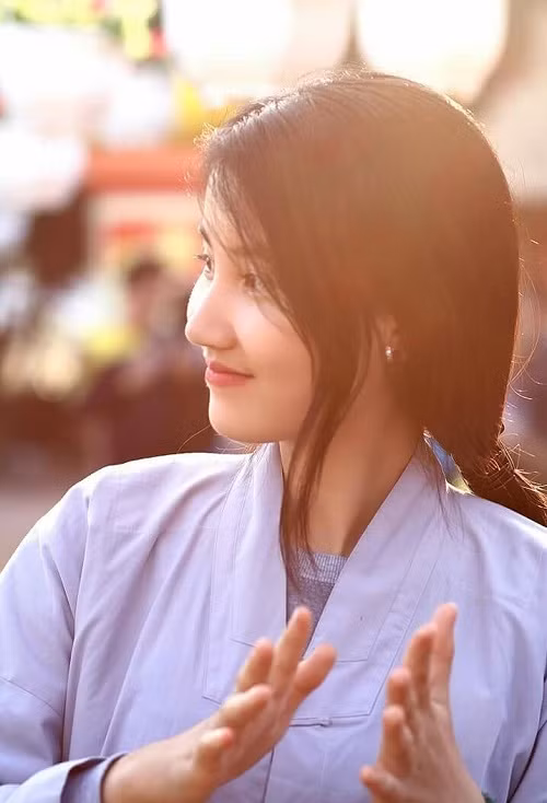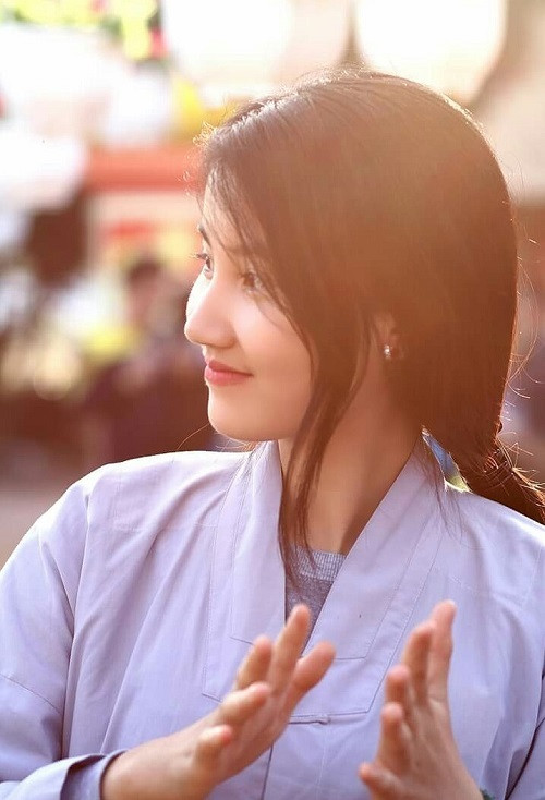 Huyền trong một lần hoạt động ở chùa. Nữ sinh thường xuyên lên chùa để nghe những bài giảng về đạo đức, đạo làm con. Đó cũng là cách giúp em tìm được niềm vui và mục đích sống.