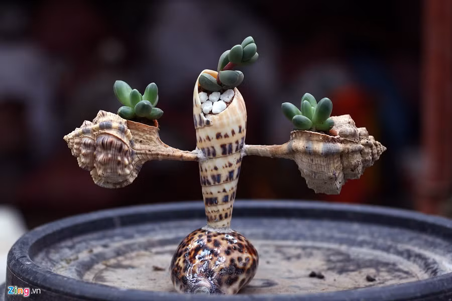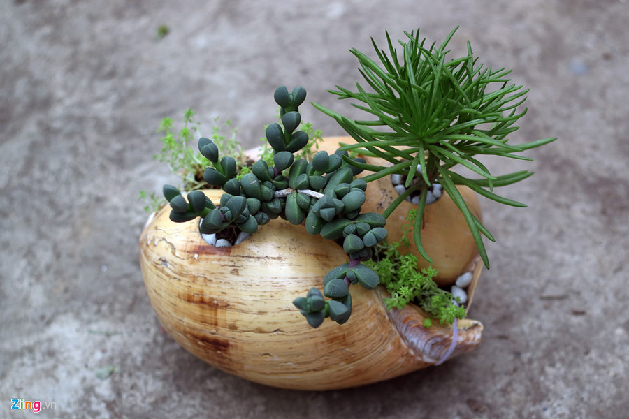 Những chậu cây bằng vỏ ốc được mài vỏ, khoét lỗ để cho đất vào bên trong, thêm các loại cây cảnh nhỏ xinh thành những tác phẩm nghệ thuật để trong nhà, trên bàn làm việc...