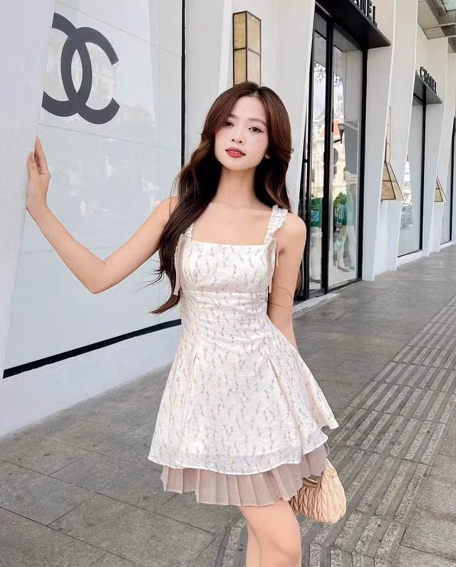 Bên cạnh đó, thiết kế cổ vuông khác lại tạo nên sự thanh thoát và nhẹ nhàng, trong khi phần chân váy xếp tầng mang lại hiệu ứng bồng bềnh, đầy nữ tính. Sự tinh tế từ họa tiết hoa nhí kết hợp cùng phom dáng thoải mái giúp tôn lên nét đẹp mềm mại, trẻ trung của người mặc.