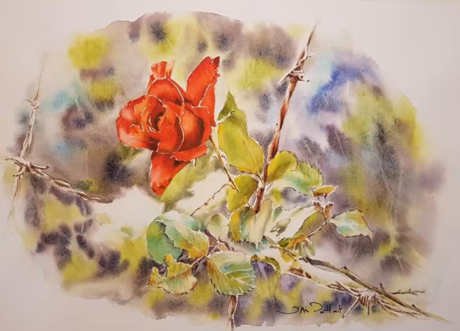- Vâng, tôi cũng vẽ cả hoa hồng. Nó rất gần gũi. Ngay trong vườn nhà tôi cũng trồng hoa hồng. Hoa hồng rất đẹp, mùi thơm ngọt ngào và có gai nữa. Chúng khiến tôi liên tưởng về phụ nữ cũng vì điều đó.