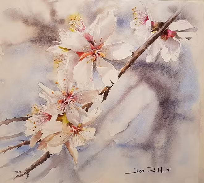 | Hoa đào luôn được họa sĩ Jean-marc Potlet yêu thích và vẽ nhiều - Ảnh: NSCC |