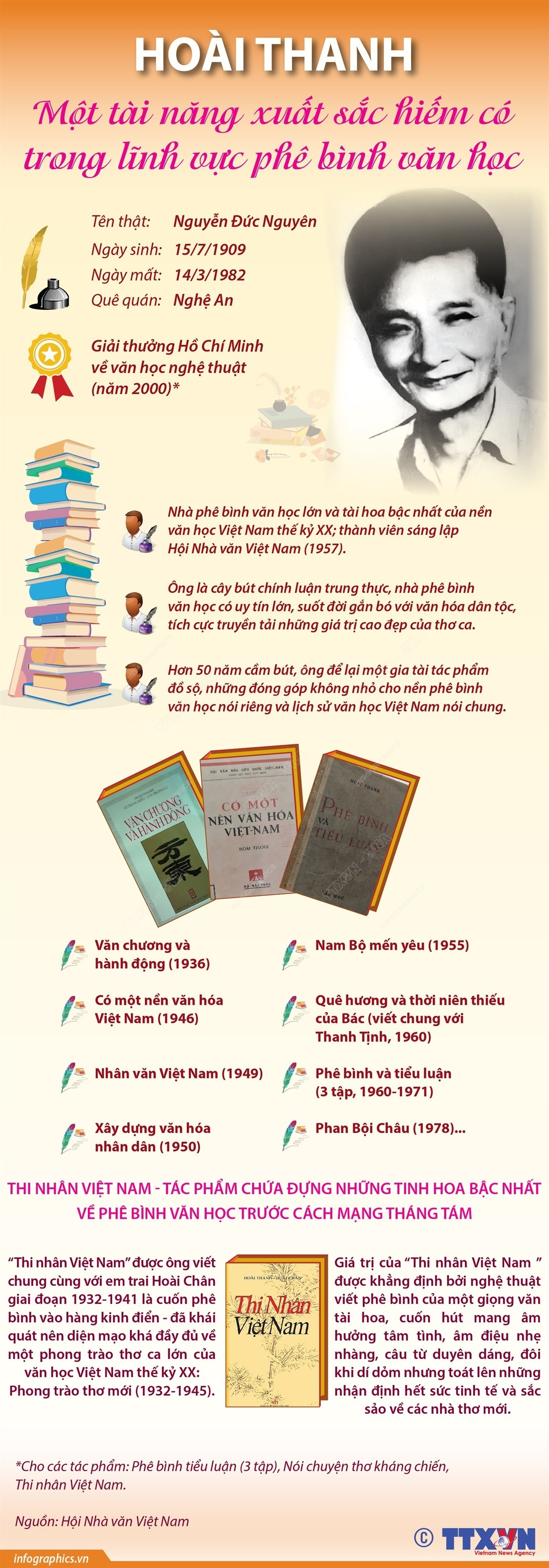 Như nhà thơ Hữu Thỉnh từng nhận định: Di sản của Hoài Thanh là một khối đồ sộ những ký thác và tin tưởng, thật đáng tự hào. Tài sản của Hoài Thanh đã đi vào lịch sử. Một tài sản lấp lánh biết bao vẻ đẹp của một nhà văn hóa và nhà phê bình văn học tiêu biểu... Ông sinh ngày 15/7/1909, cách đây 115 năm.