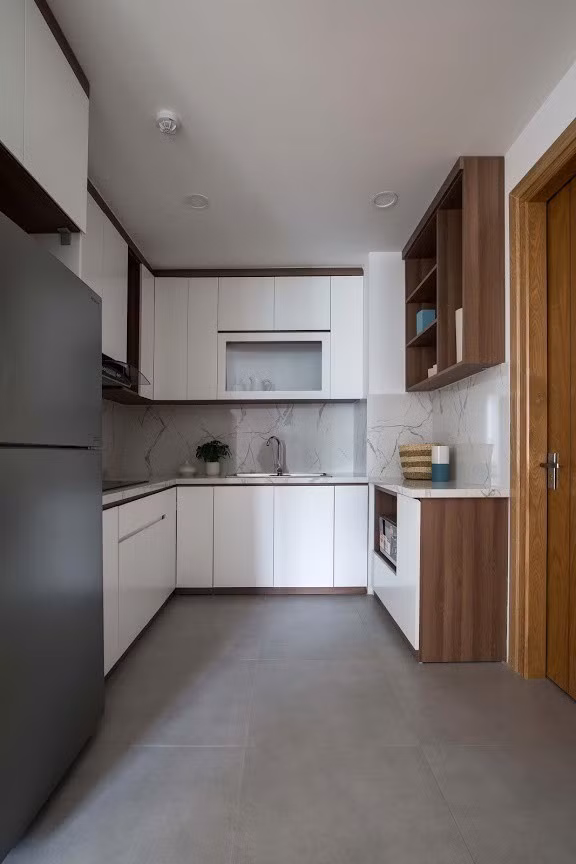 Điểm hạn chế của căn hộ là phòng bếp bố trí ở góc xa ban công nên chỉ nhận được một phần nhỏ ánh sáng tự nhiên.