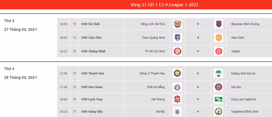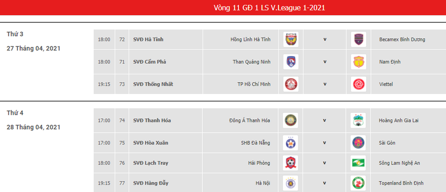 | Lịch thi đấu vòng 11 và bảng xếp hạng V.League 2021. |