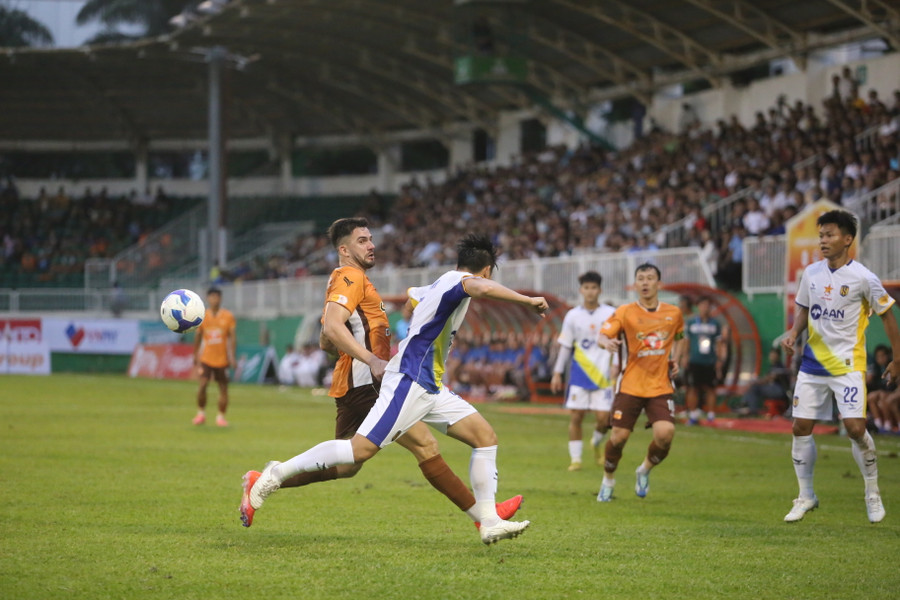 Với lợi thế thể chất của những ngoại binh, đội bóng thành Nam đã gây không ít khó khăn cho khung thành của HAGL. Phút 71, Xuân Son bật cao đánh đầu hiểm hóc buộc thủ thành Trung Kiên phải nhoài người hết cỡ để đẩy bóng bay vọt xà ngang.