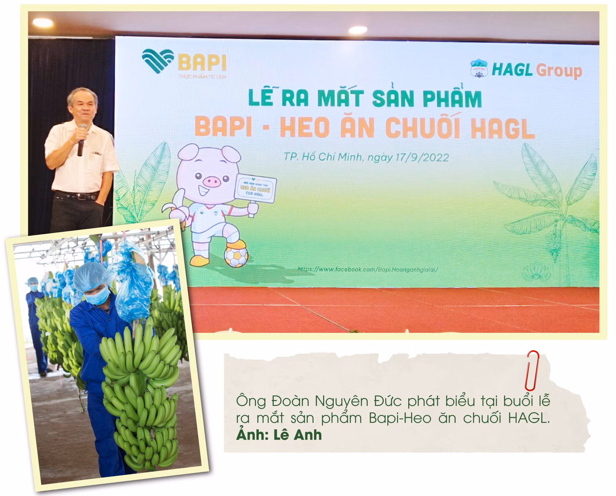 “Từ lúc có nguồn tiền của anh Dương hỗ trợ HAGL quản lý, Công ty nông nghiệp chúng tôi rảnh tay tái cấu trúc lần nữa. Khoản nợ 28.000 tỷ đồng, đến giờ đã giảm xuống còn 8.000 tỷ đồng. Nhưng để tái cấu trúc, tôi cùng các cộng sự phải suy nghĩ rất nhiều, vì làm gì thì làm quá 3 năm là chịu không nổi. Lúc này, trong suy nghĩ của tôi chỉ có đầu tư vào “1 cây và 1 con” là cây chuối và con heo. Thời gian đầu tư đến thu hoạch thì cây chuối vào khoảng 9 tháng, heo cũng tương đương. Tôi đã tính toán, mỗi năm, HAGL thải ra 200.000 tấn chuối không đảm bảo tiêu chuẩn xuất khẩu nên phải tận dụng khối lượng chuối thải loại. Lập tức, tôi mời kỹ sư nông nghiệp Trần Văn Dai-thành viên Hội đồng Quản trị về nghiên cứu. Toàn bộ quá trình nghiên cứu, chăn nuôi chỉ trong 6 tháng. Sau đó, tôi mời tất cả cộng sự thưởng thức món thịt heo ăn chuối thì mọi người đều tấm tắc khen thịt heo ngon”-ông Đoàn Nguyên Đức nhớ lại hành trình đến với sản phẩm thịt heo ăn chuối.