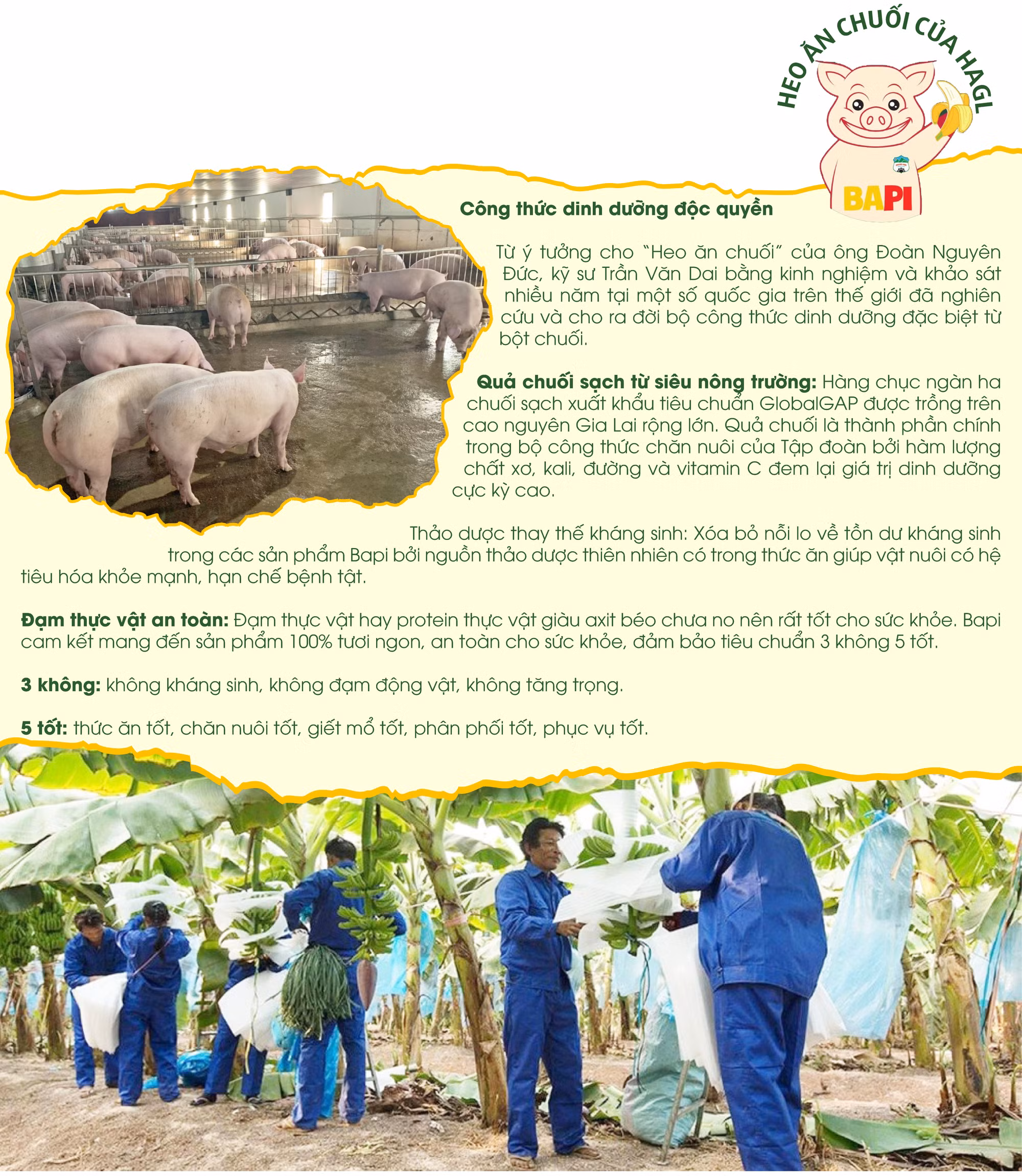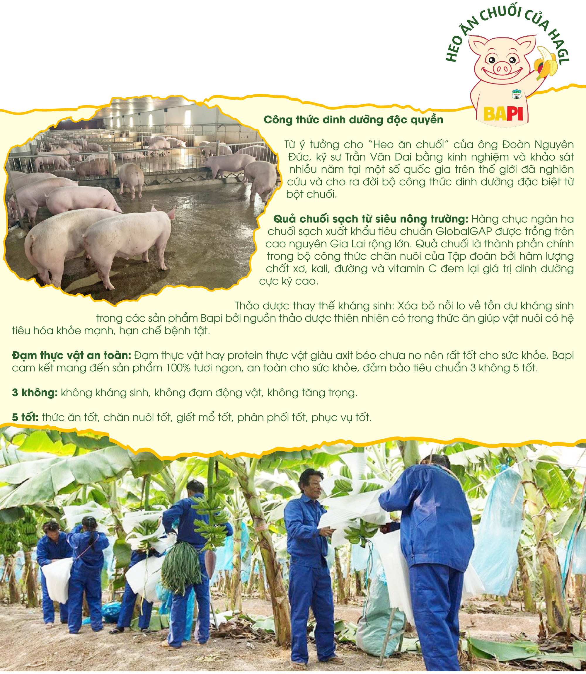 Cũng theo Chủ tịch Tập đoàn HAGL, nếu chăn nuôi heo theo hướng công nghiệp thì khó có thể cạnh tranh với các tập đoàn chăn nuôi lớn của nước ngoài đầu tư vào Việt Nam trước đó. Trong khi HAGL có quỹ đất lớn, những khu trang trại chăn nuôi của HAGL nằm cách biệt dưới vườn chuối, được đặt ở nơi có độ cao 800 m so với mực nước biển, nhiệt độ dao động trong khoảng 20-26 độ C. Đây là điều kiện tốt để đàn heo phát triển. Diện tích chuối của HAGL khoảng 7.000 ha, ở 3 nước Lào, Campuchia, Việt Nam (Gia Lai khoảng 2.000 ha). Quả chuối đủ tiêu chuẩn, được chọn lọc làm hàng xuất khẩu sang Trung Quốc, Hàn Quốc, Nhật Bản, số còn lại được tận dụng làm thức ăn cho đàn heo khoảng 400.000 con. Một phần chuối được ủ chín cho heo nái ăn, phần còn lại được thái lát, sấy khô và nghiền thành bột. Trong thành phần thức ăn hàng ngày của đàn heo, bột chuối và chuối chín chiếm tới 40%, còn lại là bắp, đậu nành, thảo dược để thay thế kháng sinh.