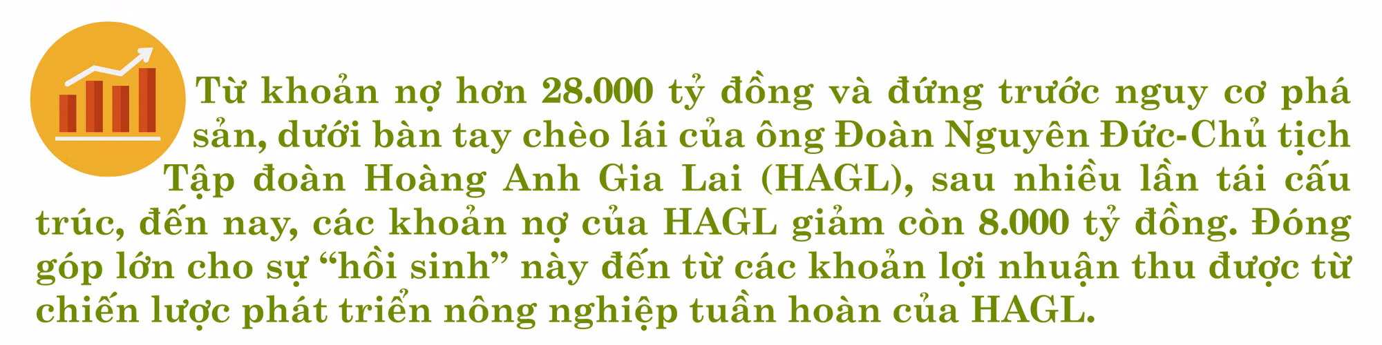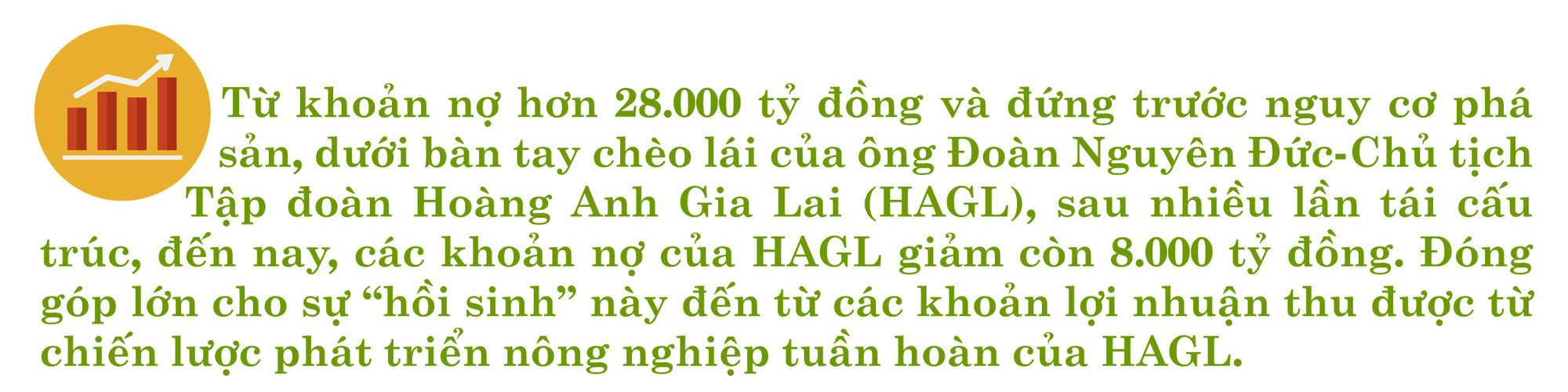 “Có lẽ tất cả mọi người nghĩ làm nông nghiệp kiểu này rất khó, nhưng tôi có thể khẳng định tỷ suất lợi nhuận trên đồng vốn bỏ ra với lợi nhuận thu về của ngành nông nghiệp không hề thấp. Chuối giá thành của chúng tôi là 6.500 đồng/kg nhưng bán ra 14.000 đồng/kg; giá heo hơi tính tất cả các chi phí là 43.000 đồng/kg, bán ra giá bình quân 62.000 đồng/kg. Ngoài nuôi heo, HAGL còn đang nuôi thí điểm 100.000 con gà trên diện tích trang trại trồng chuối ở huyện Mang Yang. Từ việc chăn nuôi này, năm 2022 là năm đầu tiên HAGL làm ăn có lãi. Theo báo cáo tài chính, trong quý II-2022, HAGL lãi hơn 273 tỷ đồng, lũy kế 6 tháng đầu năm lãi sau thuế đạt 531 tỷ đồng (tăng 64 lần so với cùng kỳ năm trước). Trong quý III-2022, dự kiến sẽ còn tăng cao. Đến bây giờ, tôi rất vui mừng tuyên bố HAGL đã thoát nạn”-Chủ tịch Đoàn Nguyên Đức vui mừng chia sẻ thành quả chiến lược kinh doanh “khác người” của mình.