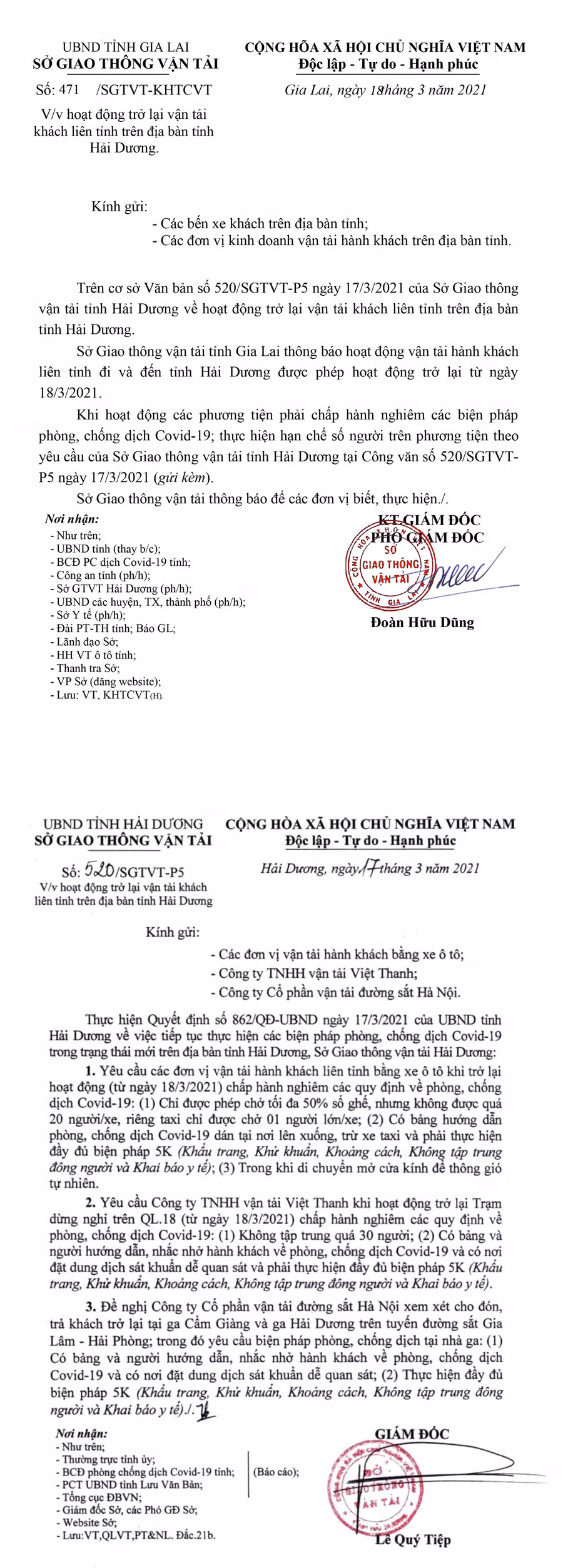 (GLO)- Sở Giao thông-Vận tải vừa có Công văn số 471 ngày 18-3-2021 về việc hoạt động trở lại vận tải khách liên tỉnh trên địa bàn tỉnh Hải Dương.