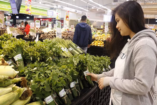 Rau gói bằng lá chuối tại một siêu thị. ẢNH: NGUYÊN NGA