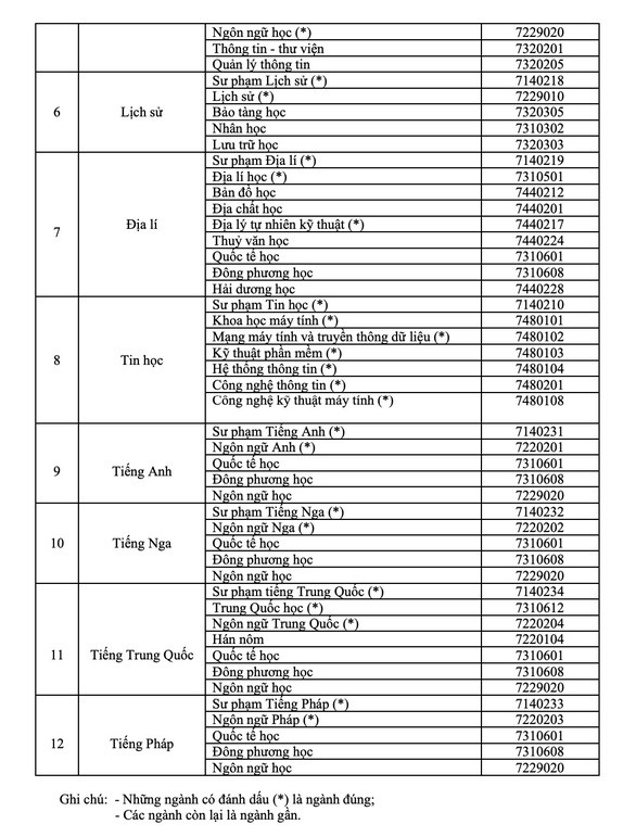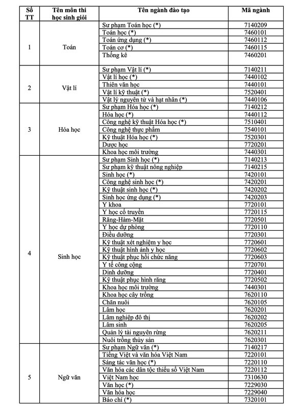 Môn sinh học có nhiều ngành tuyển thẳng nhất với 25 ngành khác nhau từ sức khỏe đến khoa học, công nghệ, nông lâm. Kế đến là ngữ văn 12 ngành, địa lý 9 ngành. Danh mục ngành đúng, ngành gần như sau: