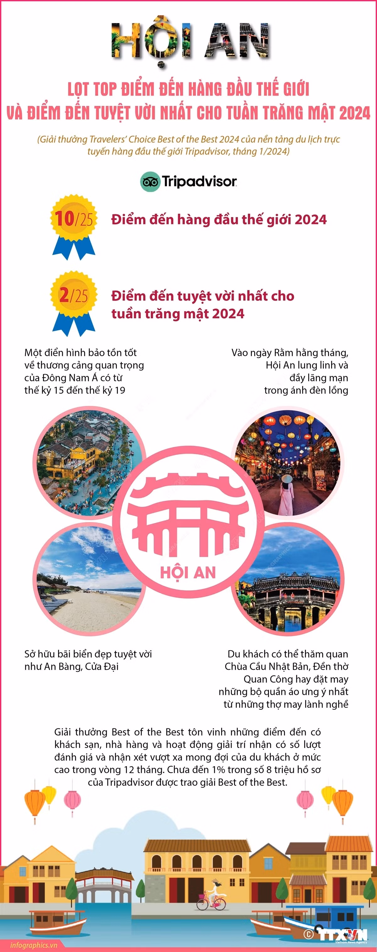 Giải thưởng Travelers’ Choice Best of the Best Destinations (Điểm đến tốt nhất trong số những điểm đến tốt nhất do du khách bình chọn) của nền tảng du lịch trực tuyến hàng đầu thế giới Tripadvisor đã vinh danh Hội An ở hạng mục Điểm đến hàng đầu thế giới 2024 và Điểm đến tuyệt vời nhất cho tuần trăng mật 2024.