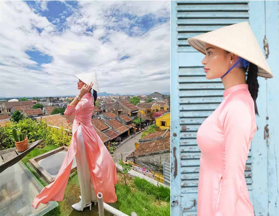 Trong hành trình khám phá phố cổ của đất Quảng, Wurtzbach còn diện bộ áo dài màu hồng nhẹ nhàng, đầu đội nón lá. Cô nhận được nhiều lời khen ngợi xinh đẹp, nữ tính và dịu dàng trong bộ trang phục truyền thống của Việt Nam. Ảnh: Piawurtzbach.