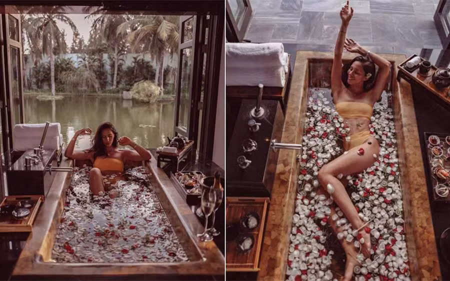 Ngoài việc thăm thú Hội An, Miss US Virgin 2016 còn tận hưởng những giây phút thư giãn tại một resort cao cấp. Cô không giấu nổi sự thích thú khi chia sẻ lên trang cá nhân: "Tôi thật sự đắm mình trong chiếc bồn tắm có 50 cây sả, 400 đóa hồng và 20 quả chanh này". Ảnh: Carolyn Carter.